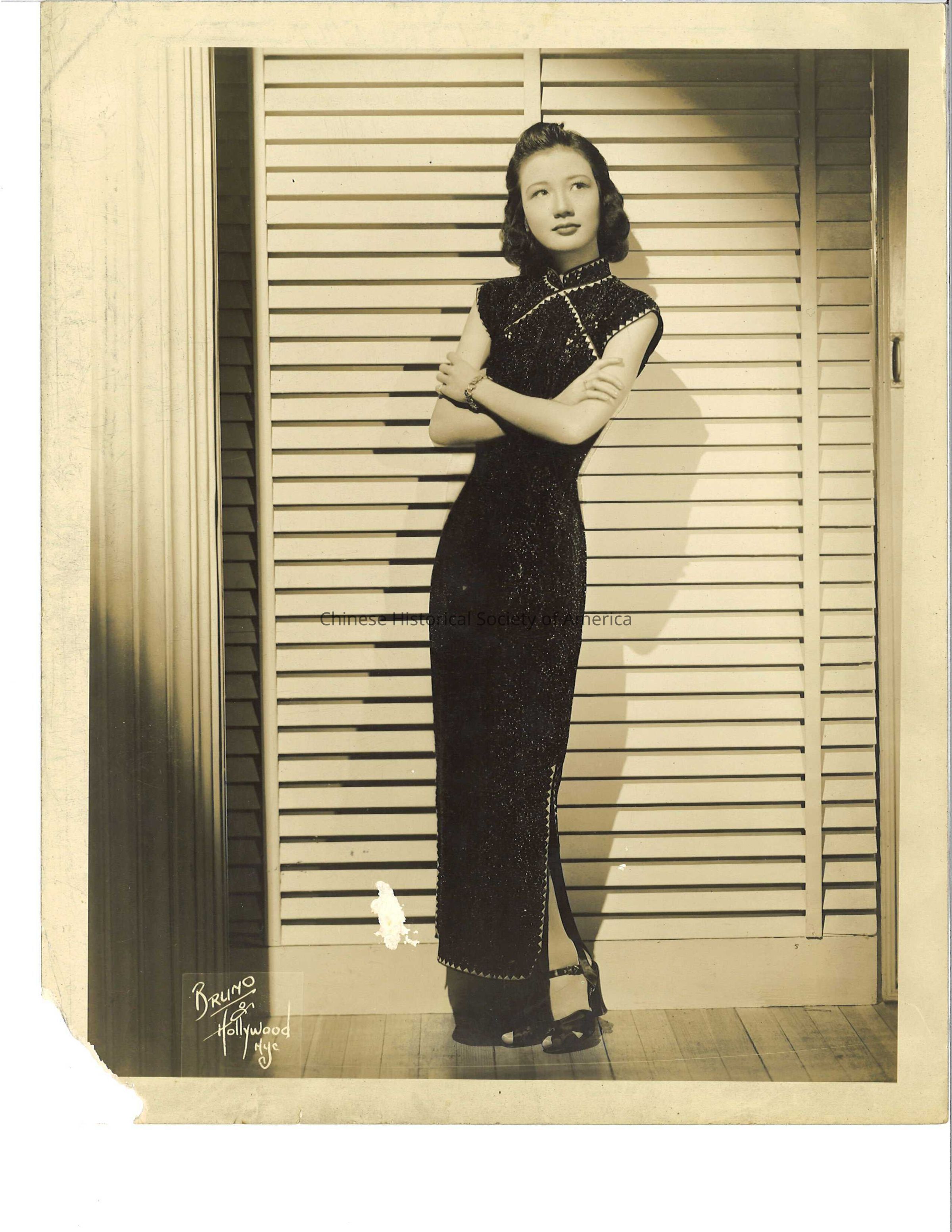 Black and white photo of a Chinese woman wearing an embroidered black dress poses in front of a screen door.