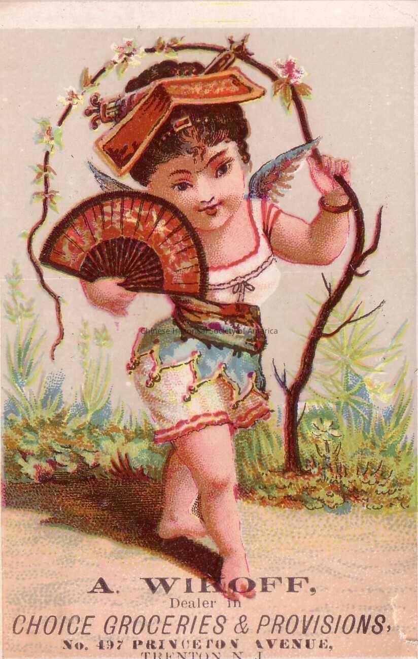 Front: A Woman is dressed in a white dress with a red border design that falls above her knees. Attached around her hips is a blue, green, and yellow apron. She is holding a Chinese embroidered fan and a blue jay bird is perched on her right shoulder. An vine like flower shroub surrounds her. Near the bottom of the tradecard is the following notation: A. Wikoff, Dealer in Choice Groceries & Provisions, No 497 Princeton Avenue, Trenton, N.J.