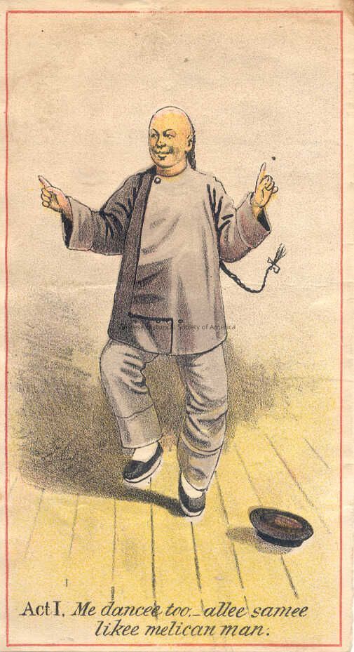 Front: A Chinese man wearing a grey traditional Chinese shirt, grey pants, and black slippers is sporting a long queue tied with a bow. The man is dancing on a wooden stage with one finger in each hand pointed upwards while his black hat has fallen and is resting upside down because of his movements. Written on the bottom of the tradecard is the following: Act I. Me dancee too-allee samee likee melican man.
