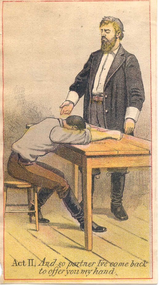 Front: A man wearing a grey shirt and brown pants tucked under his long black leather boots is sitting on a wooden stool as he rests his hands and his head on a wood table. Another man wearing a white shirt, black pants, black boots, and a long black coat is standing in front of him while he looks down at the man and offers him his hand. Written on the bottom of the tradecard is the following: Act II. And so partner I've come back to off you my hand.
