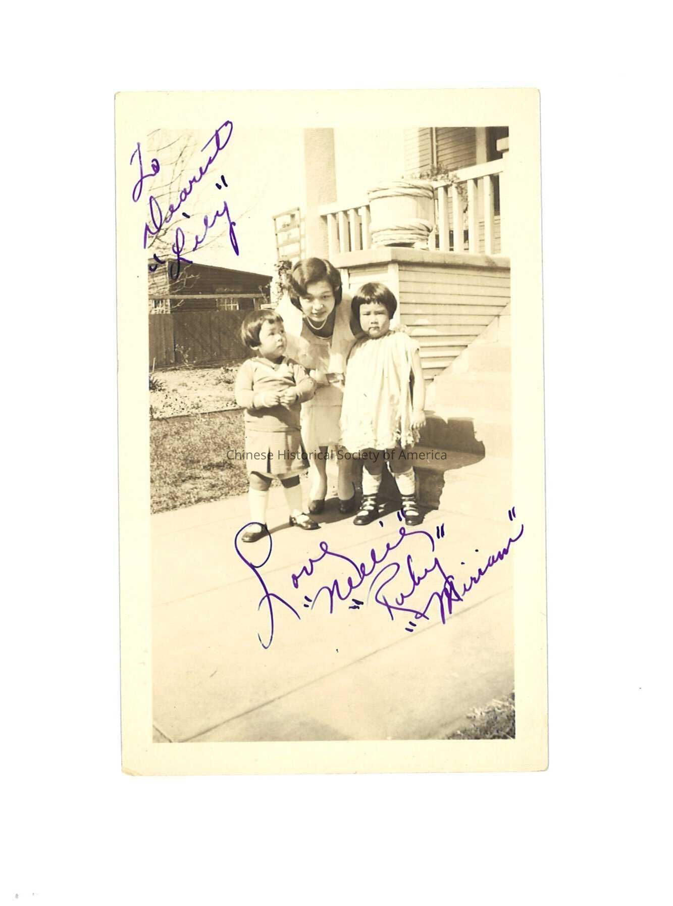 Black and white photo of a Chinese woman bending over two young Chinese girls in front of a house. Photo is signed in ink: To Dearest "Lily," and Love "Nellie" "Ruby" "Miriam."