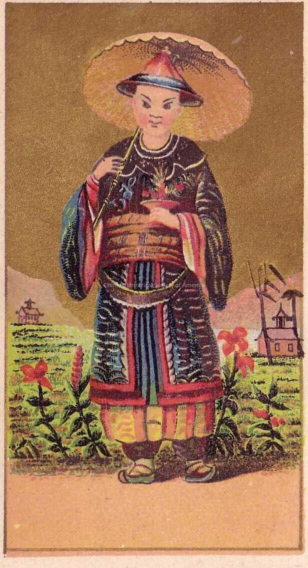 Front: An Asian man dressed in traditional clothing stands in front of a farming plantation. He is wearing a black, brown, and blue robe with red and yellow stripe pants. On his feet are pointy slippers, and a triangular hat rest at the top of his head. With his right hand the man is holding an umbrella and with his left, he is holding onto a pot with a plant in it. In the background there is a farm house and horizontal rows of greenery.