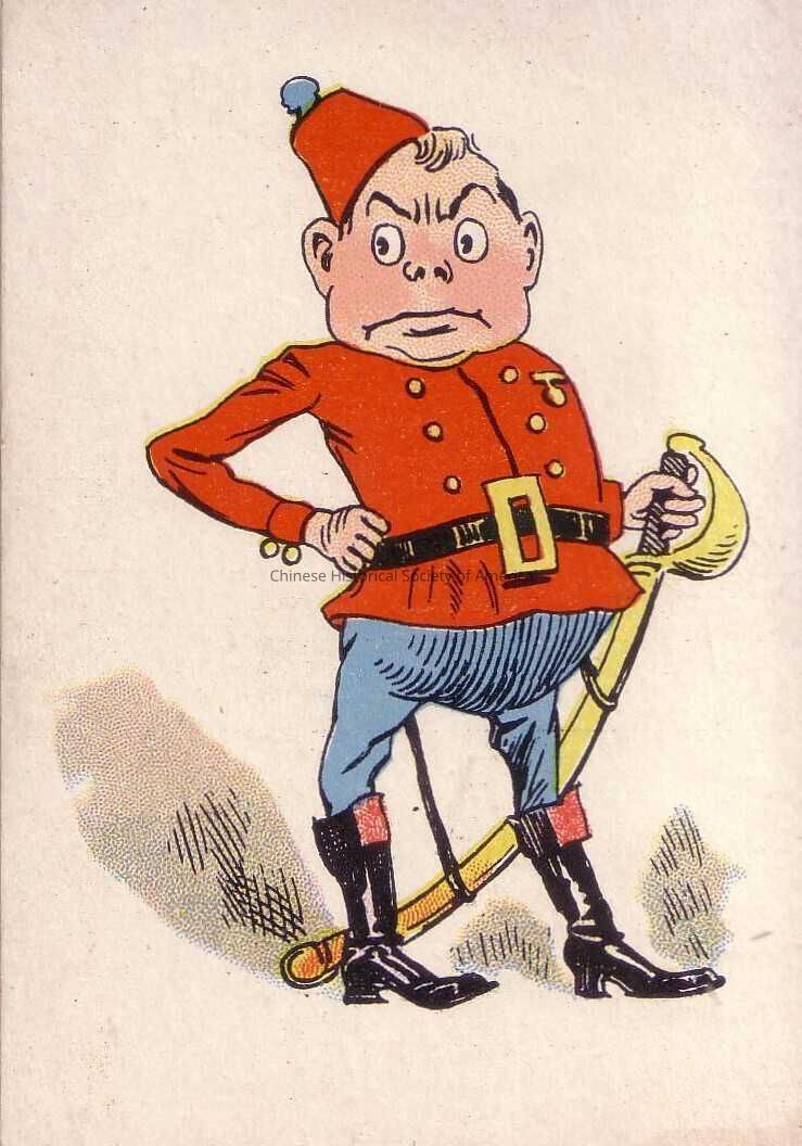 Front: An elf-like man dressed in a soldier costume has an upset look to his facial expression. The man is carrying a yellow sword, while wearing knee-high black leather boots, blue pants, a red shirt fastened to him by a black belt with a yellow buckle and a small red cap. In his left hand is a big yellow sword.