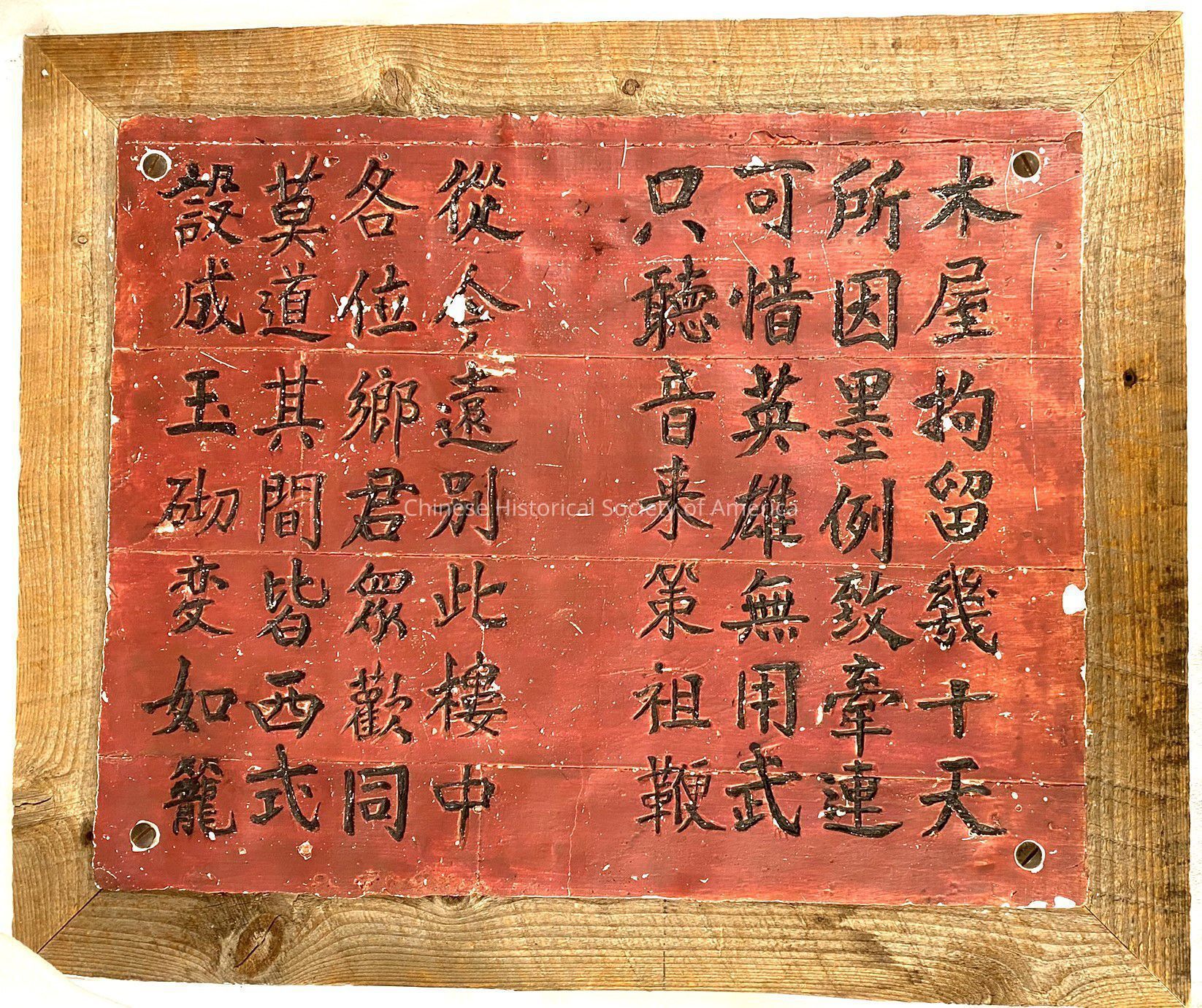 Red piece of wall with poetry carved into it, framed in a wooden frame, from Angel Island.