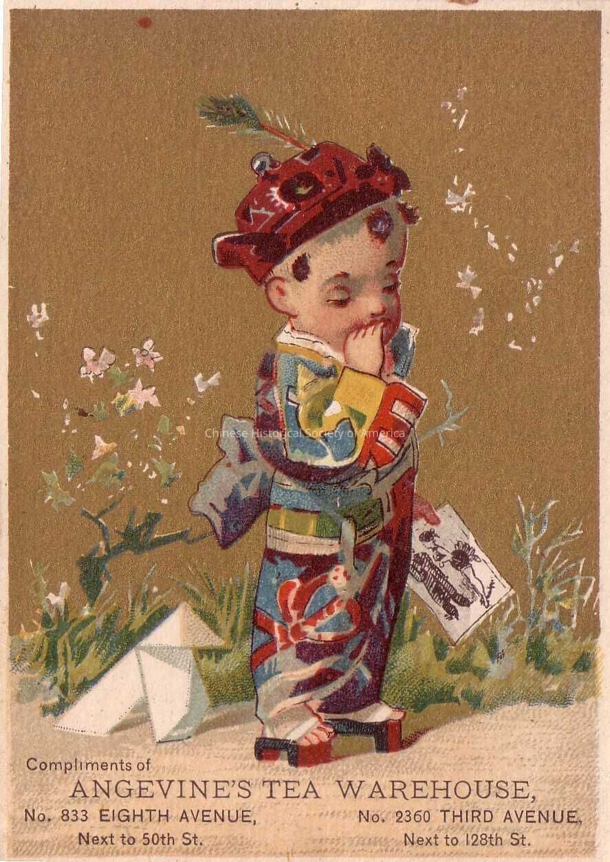 Front: A Chinese boy dressed in a colorful traditional robe, and who is also wearing a hat and wooden sandals, is sucking on his fingers while he holds a black and white drawing of a woman with a tutu style dress and a man in a suit. Next to him is an white enveloped that the picture came from. Behind the boy is a gold background with growing grass and flowers. Advertised at the bottom of the tradecard is the following: