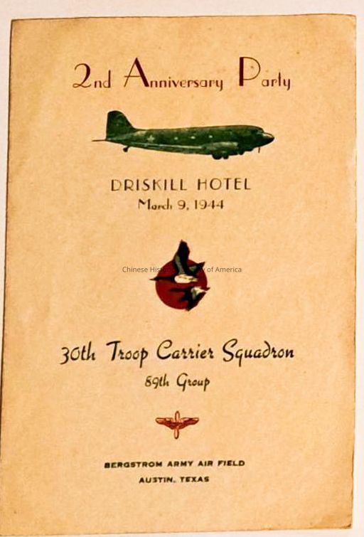 30th Troop Carrier Squadron 89th group, Bergstrom Army Air Field, Austin TX. March 9, 1944 Driskill Hotel; includes roster of officers and enlisted menContext