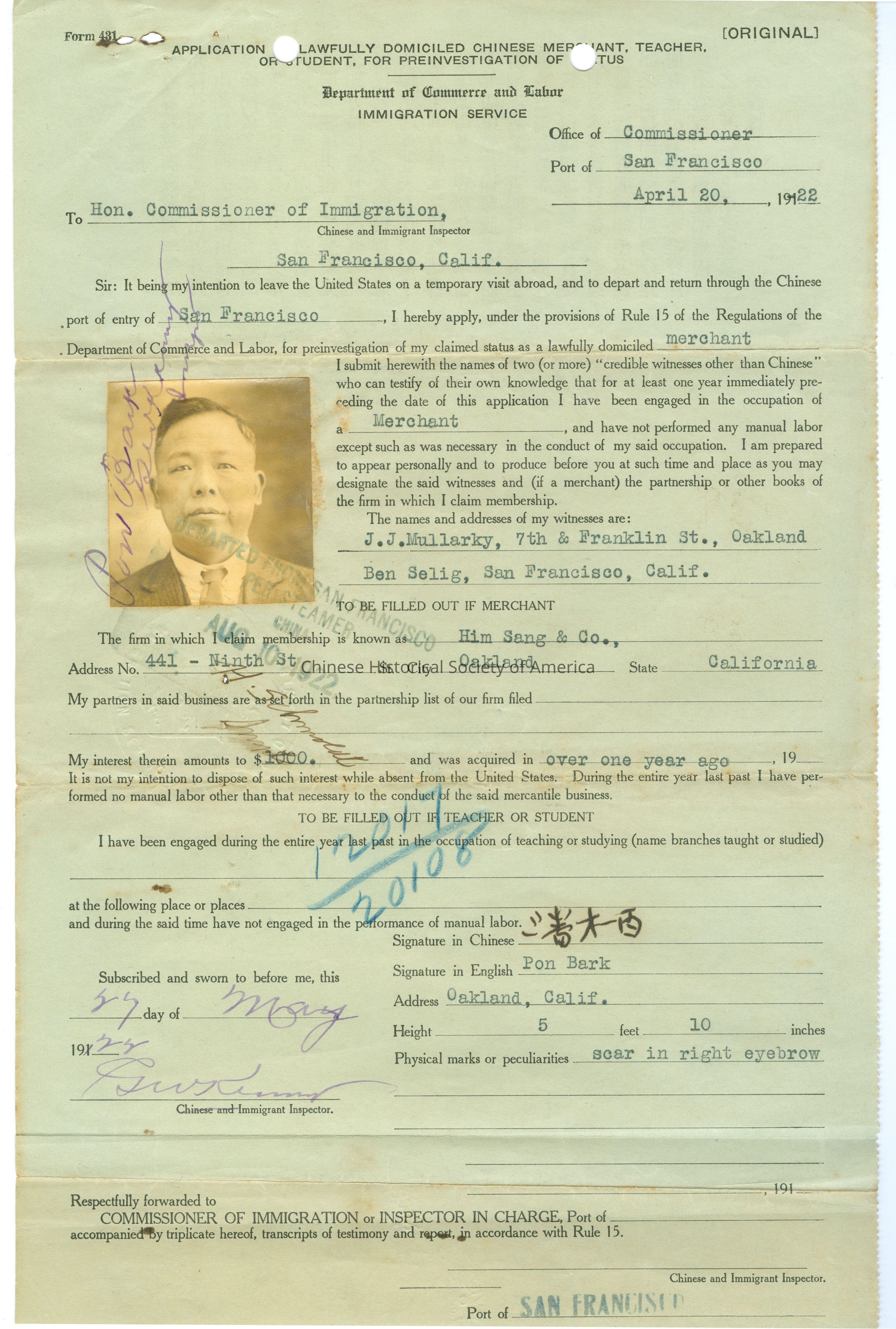 The document is a form of Application of Lawfully Domiciled Chinese Merchant, Teacher, or Student, for Reinvestigation of Status in 1922. Pon Bark, the applicant, applied to travel aboard and reenter the US through the Chinese port of entry of San Francisco. Pon Bark was claimed a merchant, living in Oakland, CA, and to own a business of Him Sang & Co. in Oakland. The document tells a story of a Chinese immigrant in 20s and provides information of immigration policy to American Chinese in 1920s in San Francisco.