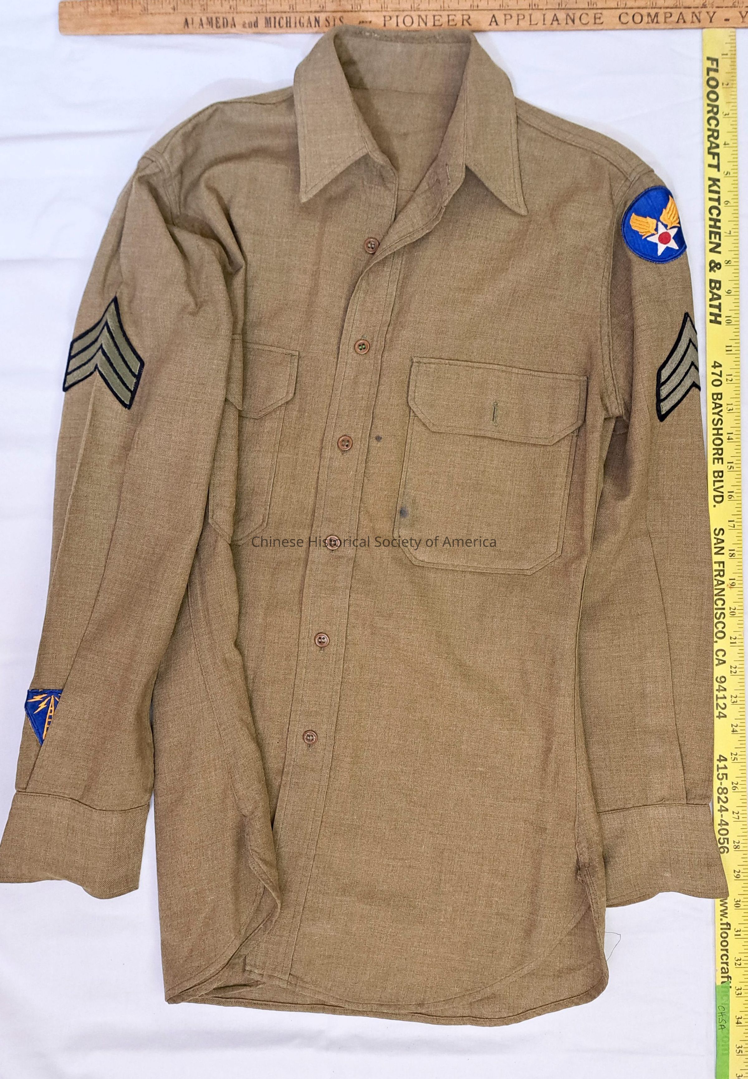 Flying tiger patch and 3 rank strips-left sleeve, 3 rank stripes and communications patch on left sleeve.