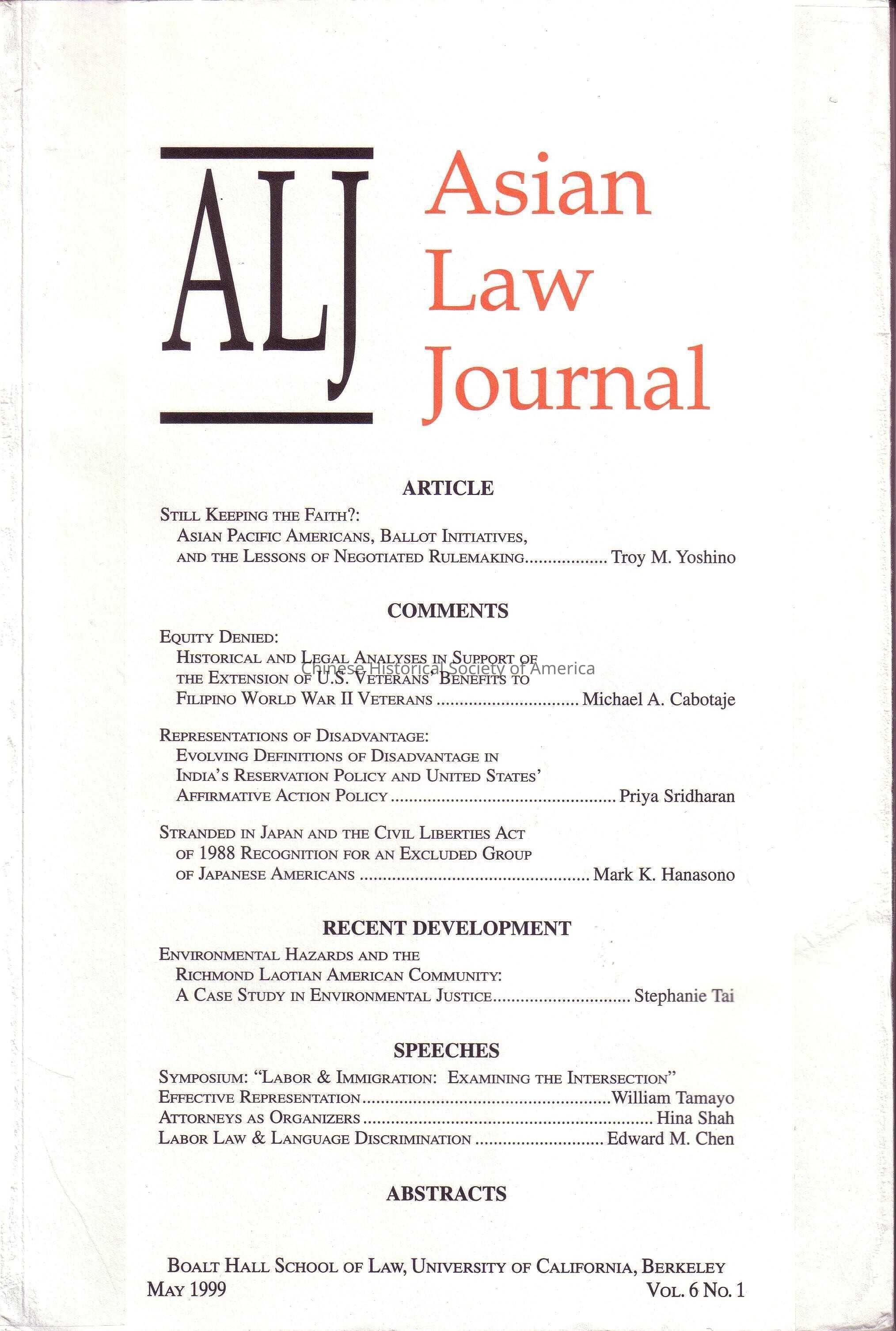 Asian Law Journal is published once a year in May by students of Boalt Hall School of Law, University of California at Berkeley.