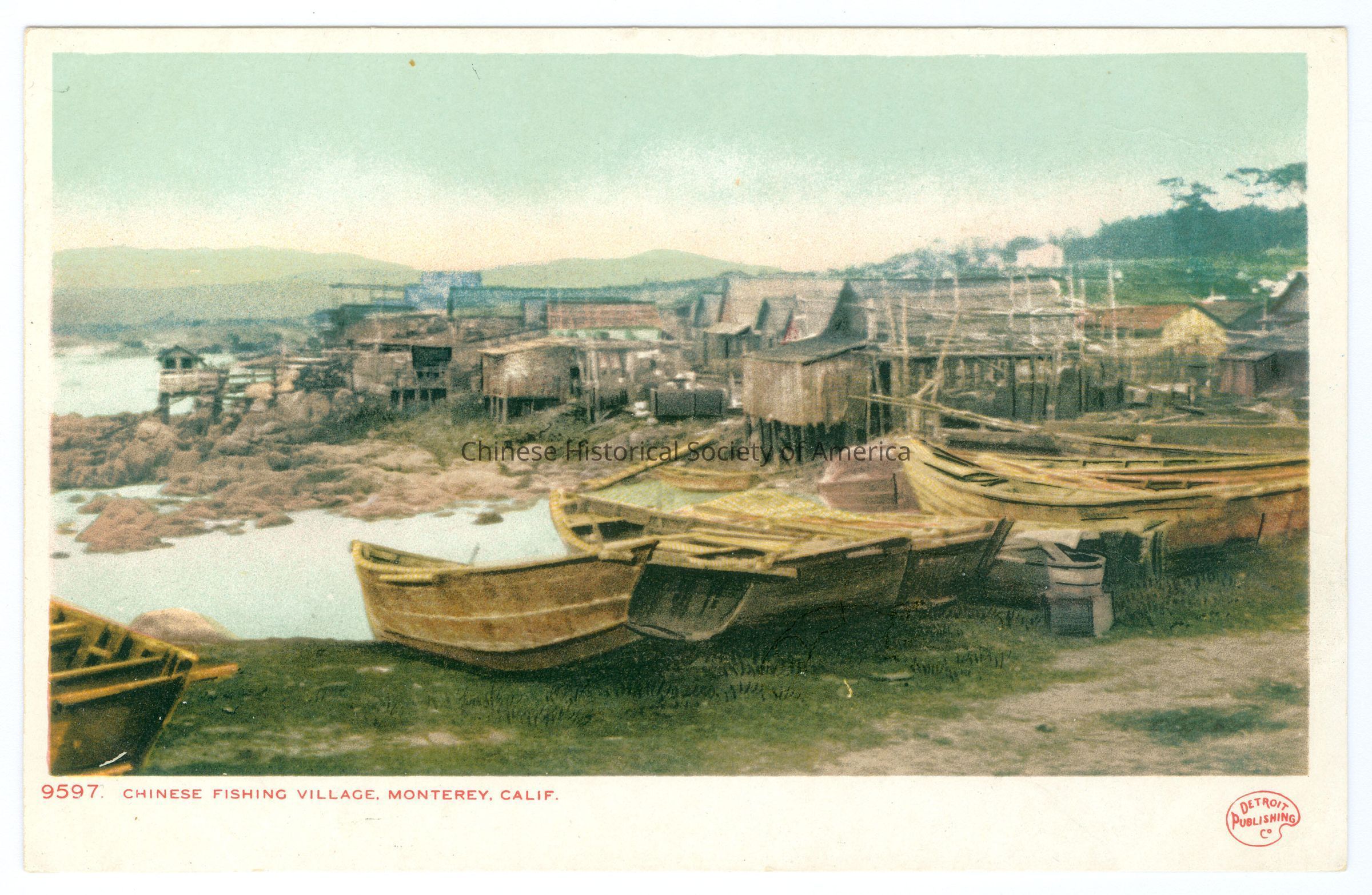 Duplicate: CHSA-04623. See Pacific Grove: CHSA-04631-04635. Front: Caption: "9597 Chinese Fishing Village, Monterey, Calif." "Detroit Publishing Co." Back: Old Accession #: DKE