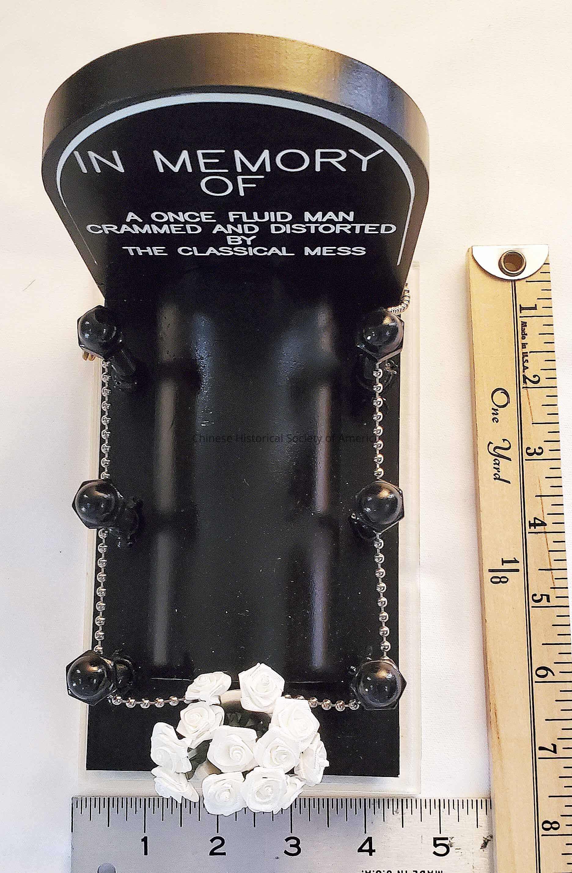 Replica of a solid metal small scale tombstone handmade by George Lee, 1967, per Bruce Lee's request.Context