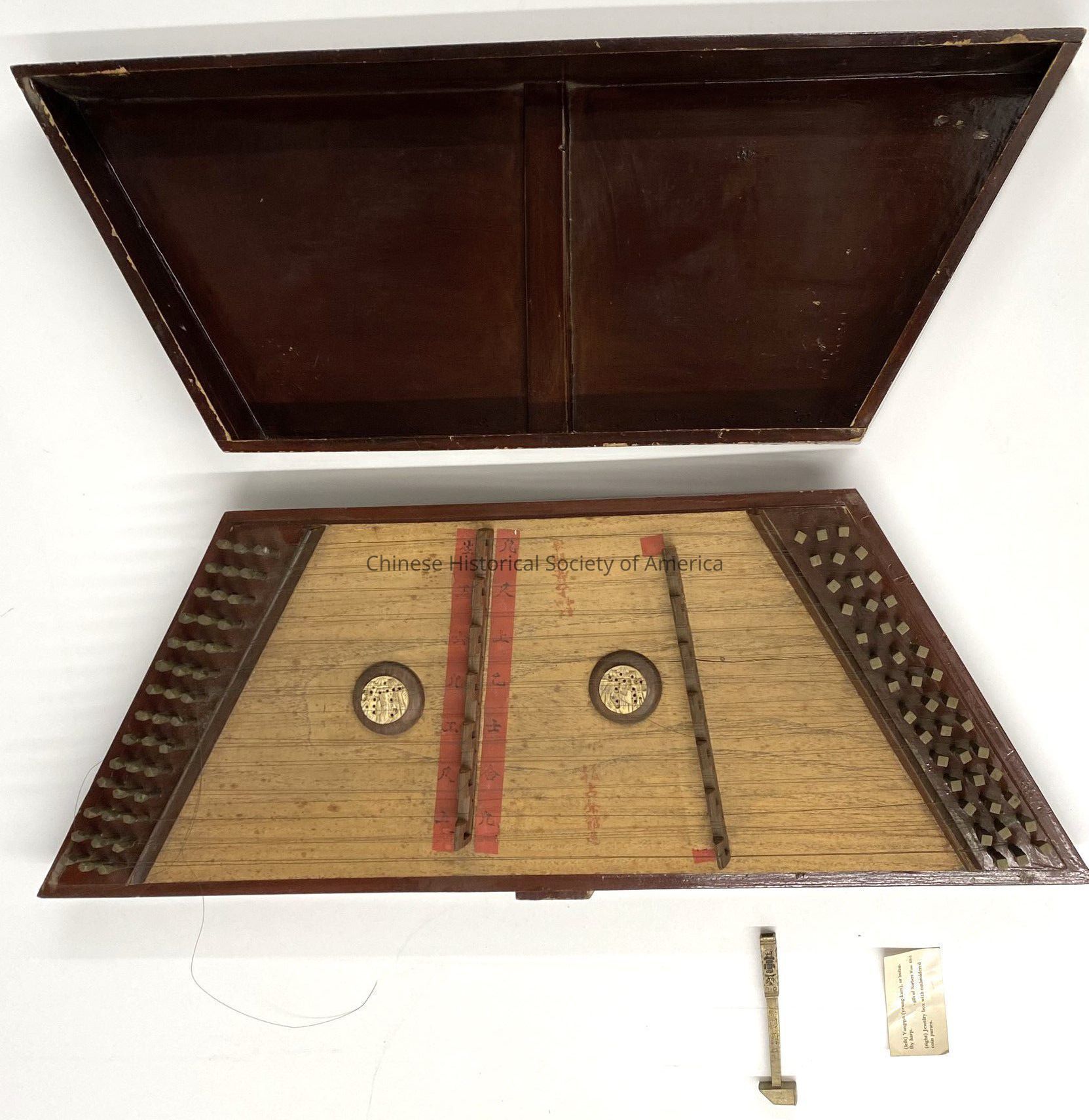 Trapezoidal yangquin (also known as butterfly harp or hammered dulcimer), lid, and tuning key. Two carved ivory or stone medallions in the middle of the instrument. There is a small drawer in the middle, on the front, which holds the tuning key. Exhibit label inside which reads, "Yangqin (yeung-kum), or butterfly harp. -gift of Norbert Woo".Context