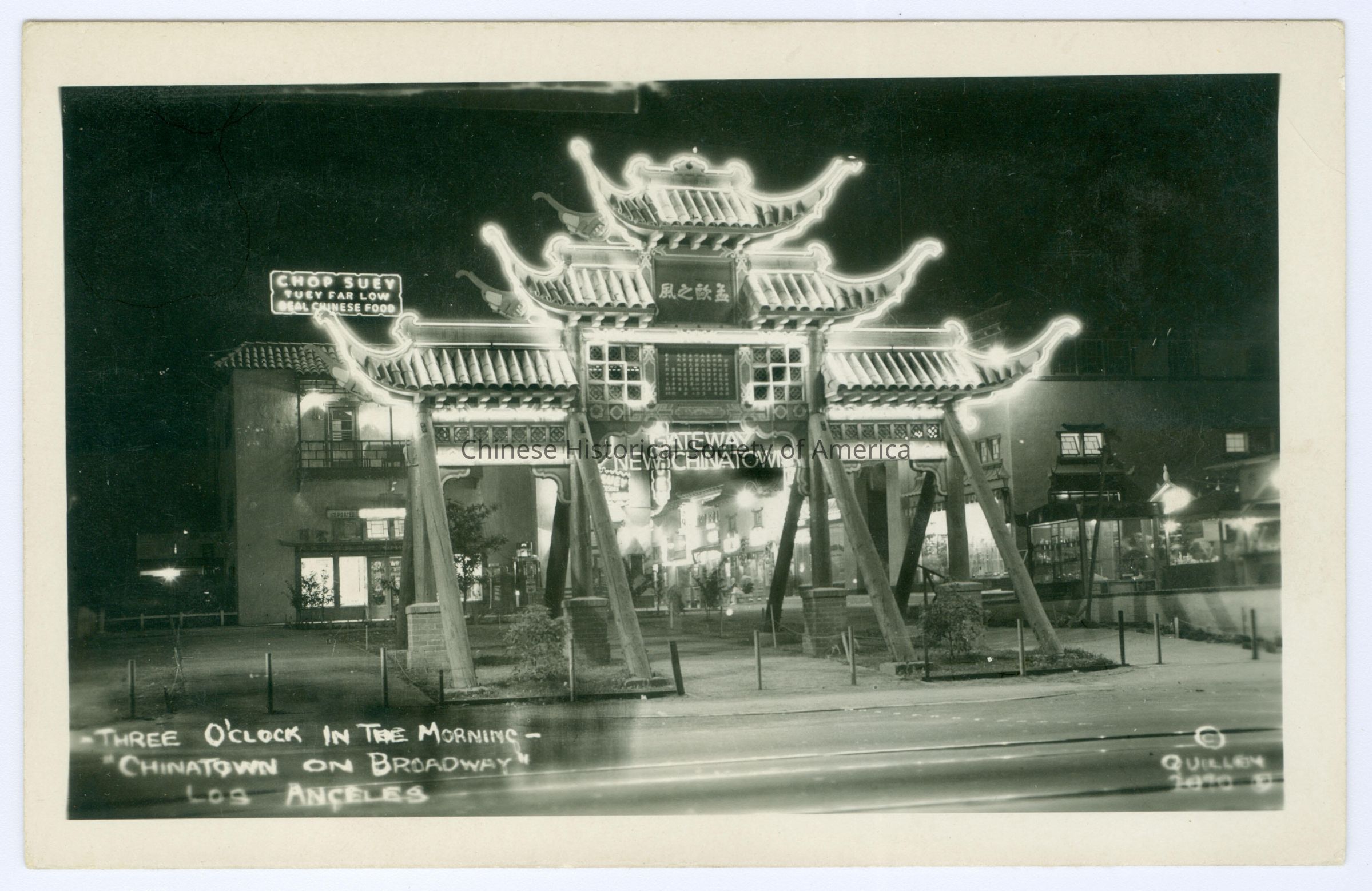 A-B: Front: Caption: "Three O'Clock in the morning-Chinatown on Broadway Los Angeles." "c. Quillen 2070." A: Back: Old Accession #: RLX.