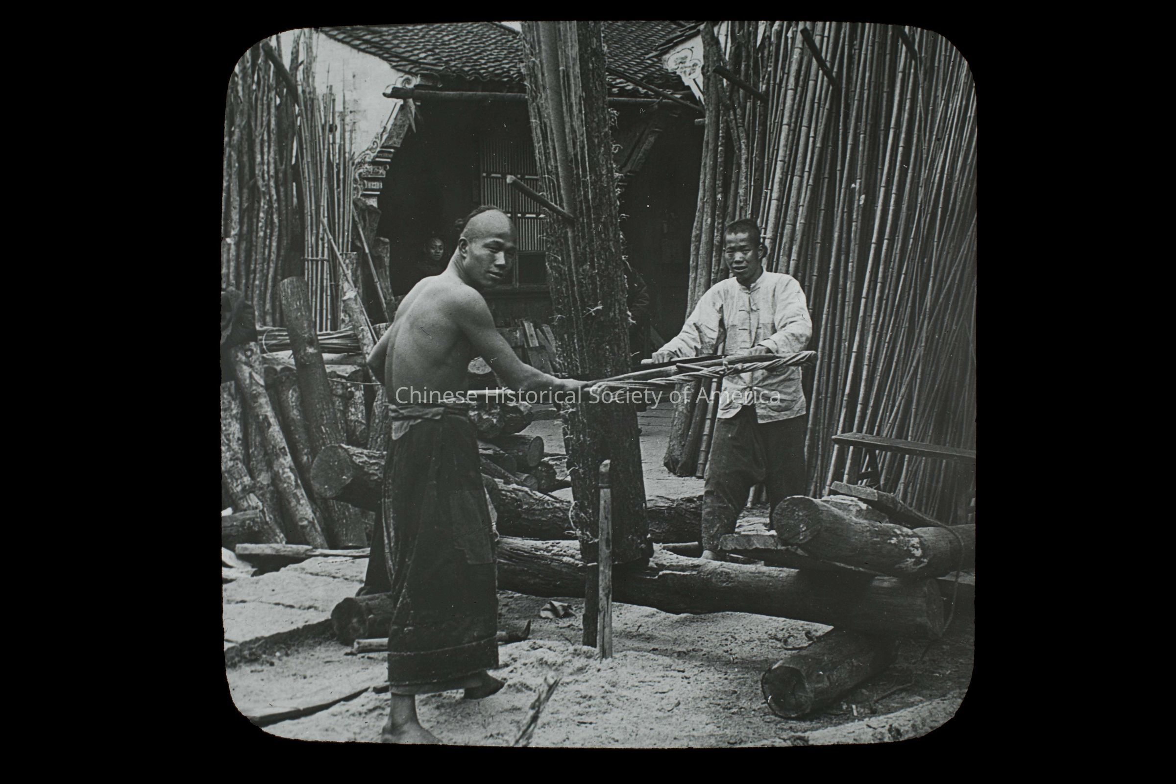 Text in the front: "9/20/81, 6N)-", handwritten in black on a flourescent label; "Keystone View Company Studios, Meadville, PA. C. Underwood & Underwood, 516 (V23947) Sawing Lumber by Hand in a Chinese Lumber Yard." There is writing on the glass in back