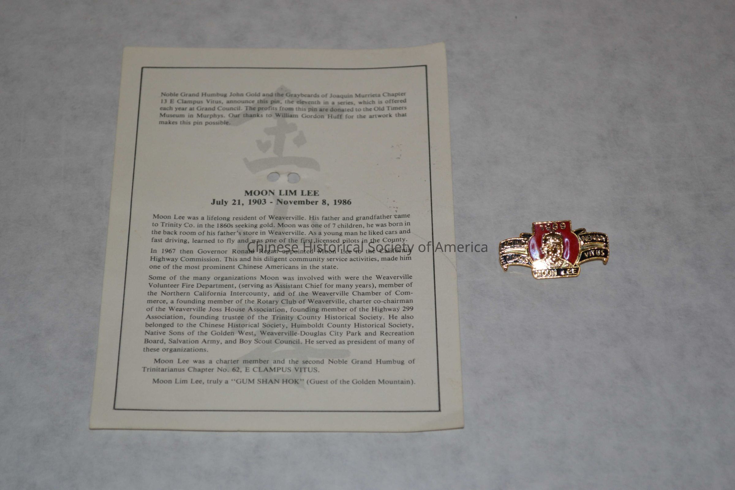 A badge with Moon Lee's portrait (A) and a paper with the description of Moon Lim Lee (B)