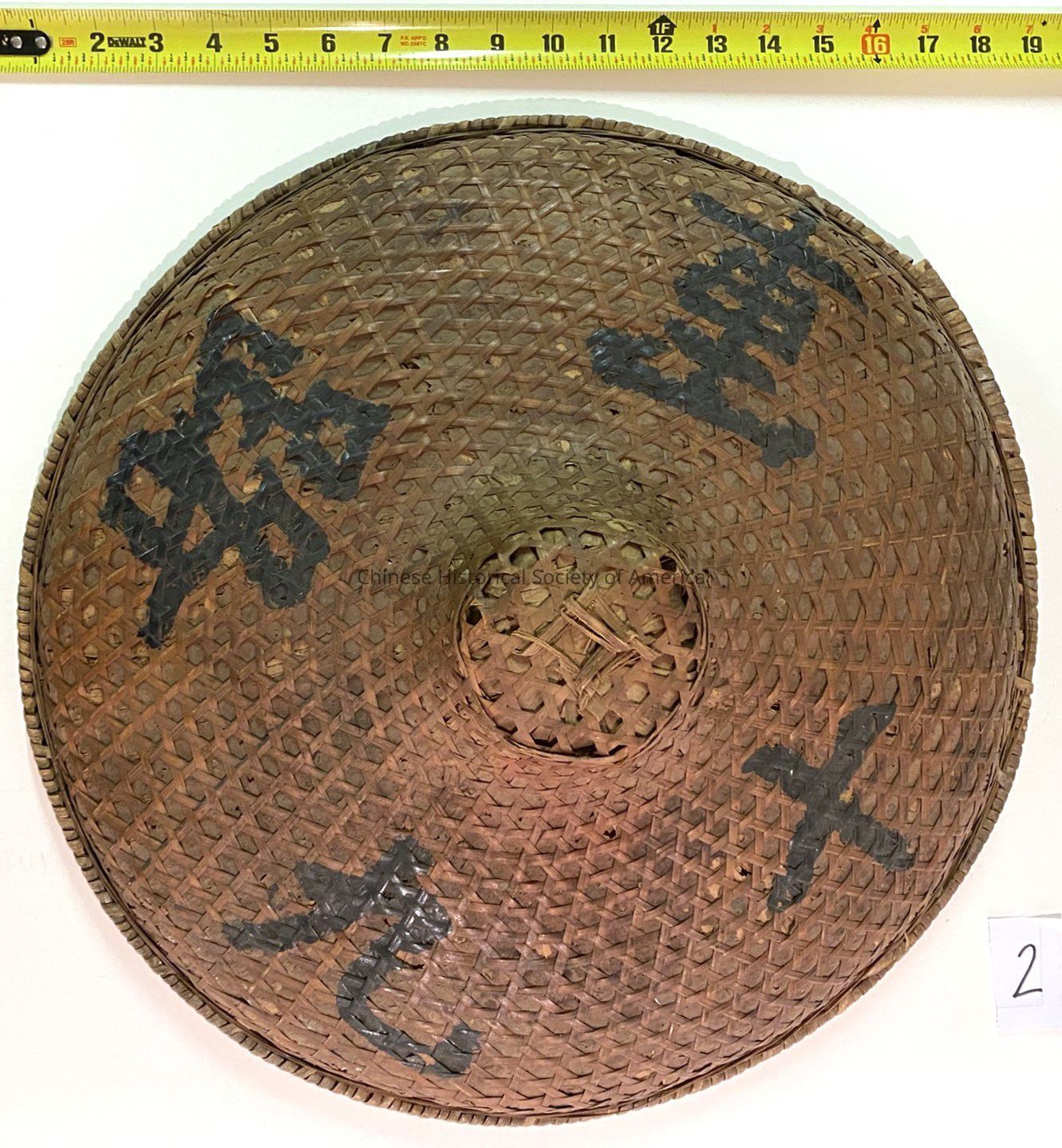 Bamboo hat with raised crown, Chinese writing around brim. Jute ties on the underside, presumably for a chin strap