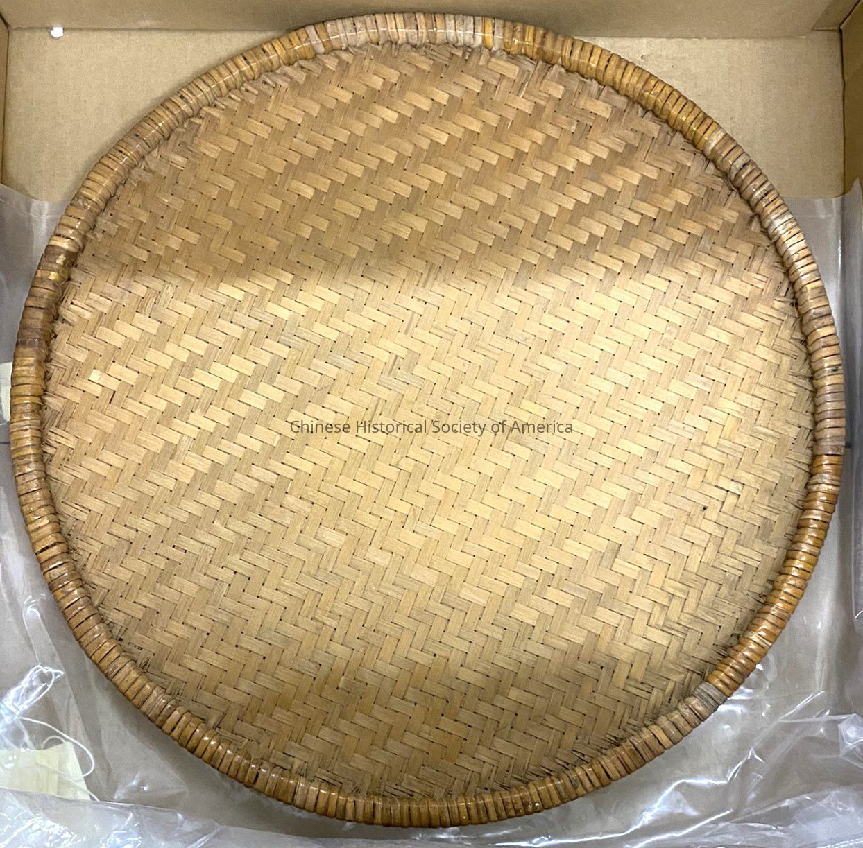 Bamboo strainer used in shrimp fishing industry, with a black "S" stamped on one side.