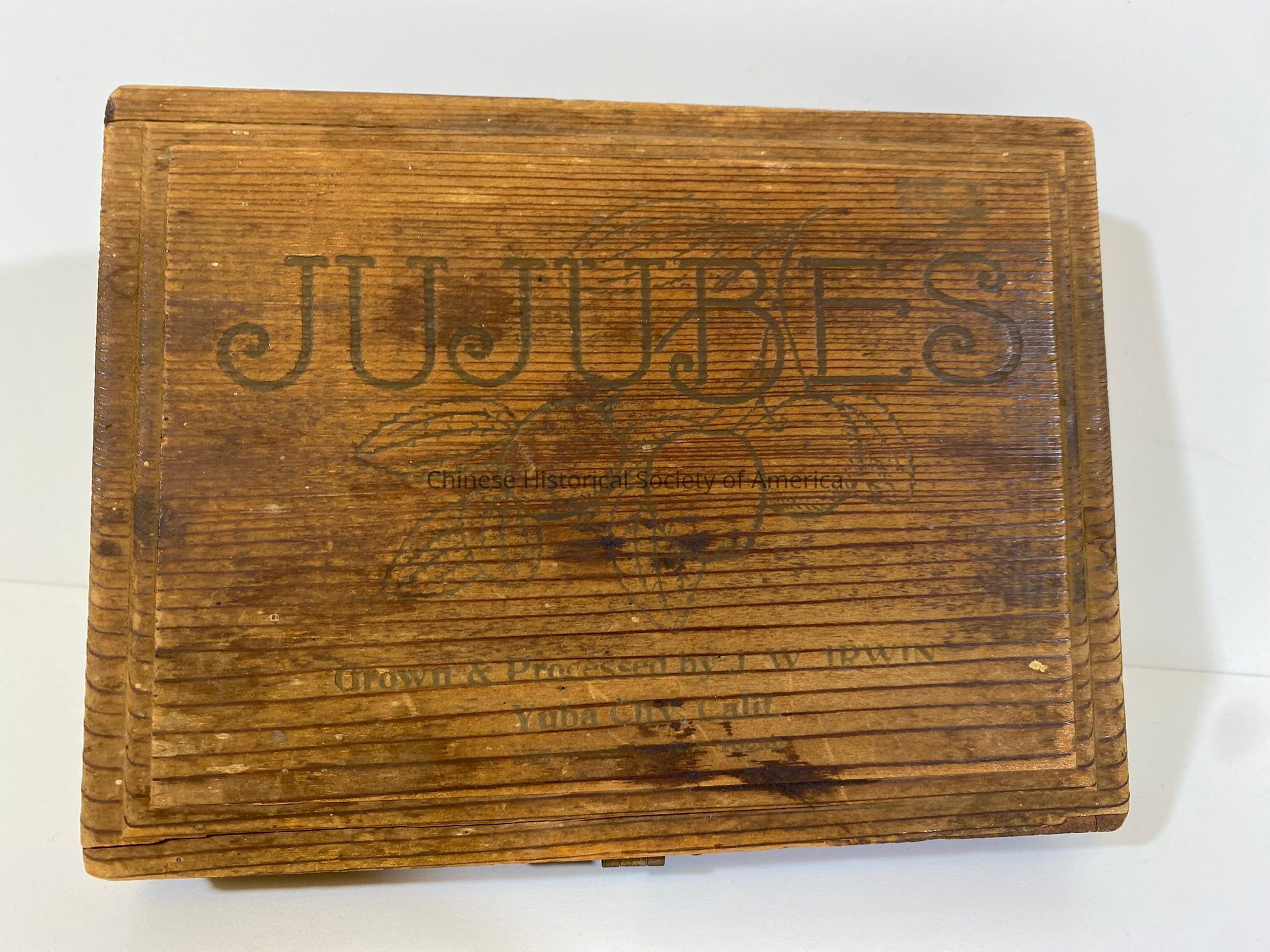 Brown wooden box with a hinged lid closed by a metal latch. The lid features a carved picture of jujubes with the words "Jujubes, Grown & Processed by J.W. Irwin, Yuba City, Calif., Net Weight One Pound".Context