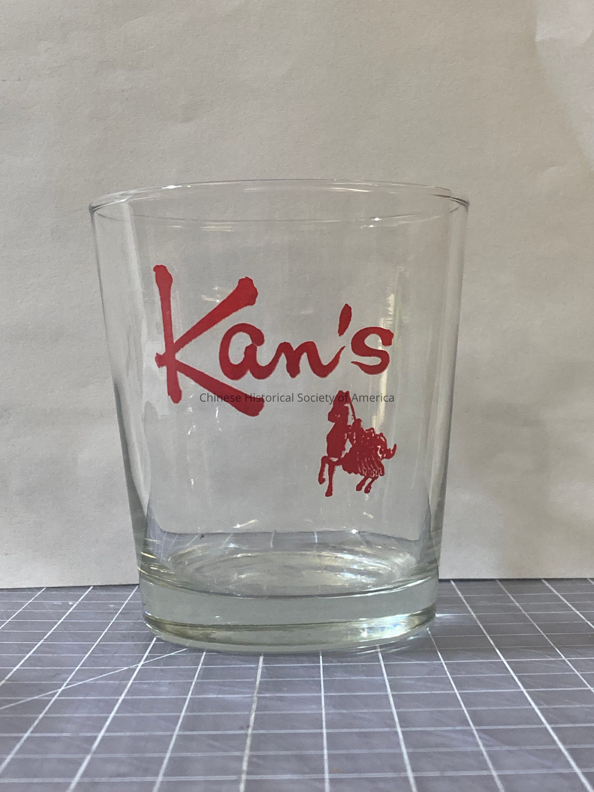 Two glasses with the logo from Kan's Restaurant in red.