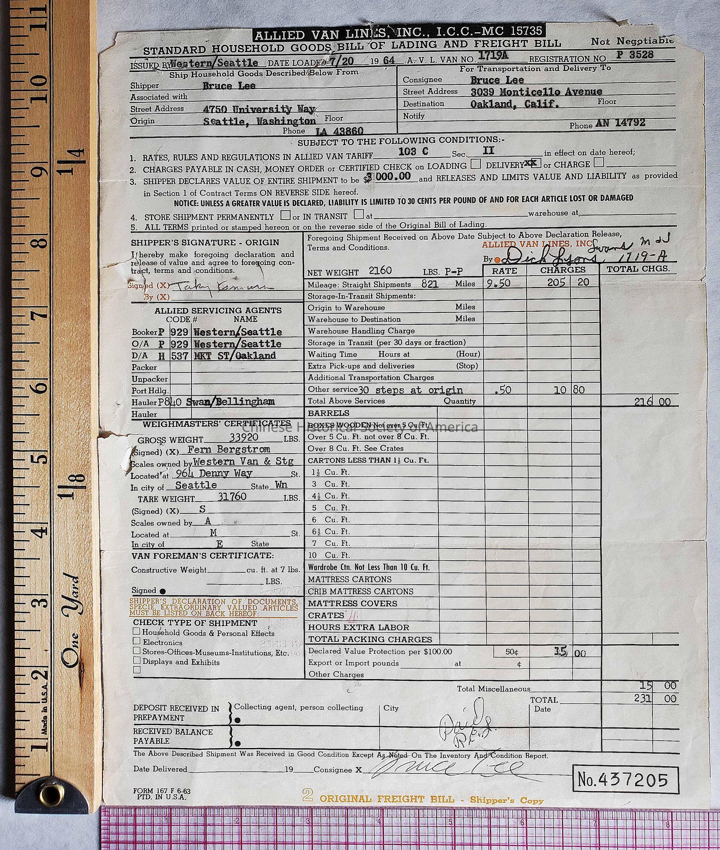 Bill of Lading from Allied Van Lines. INC. Shipping from Seattle, WA to Oakland, CA
