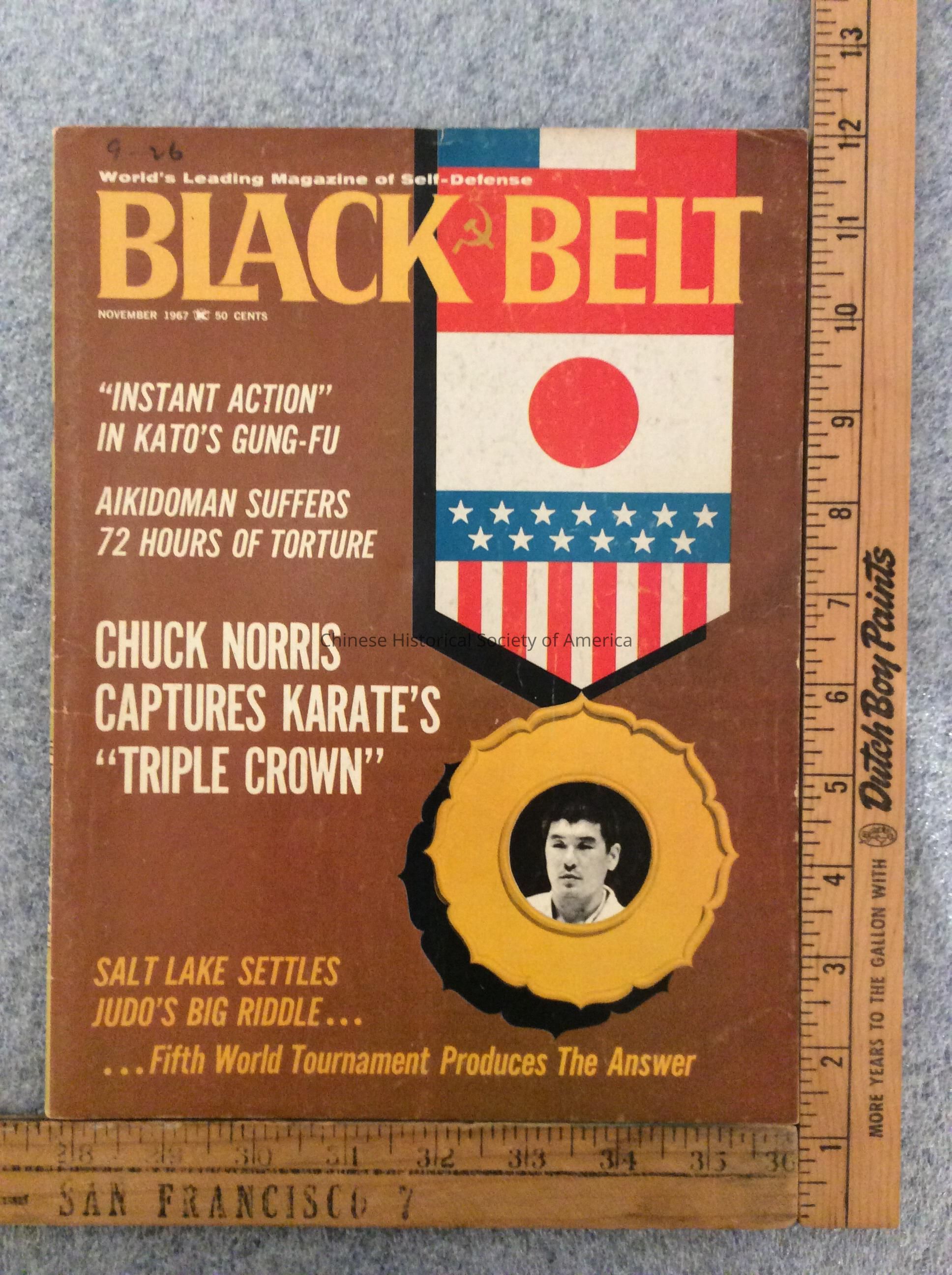 "Black Belt" at the top of the front cover, a medal with country flags at the right side of the front cover; opened to page 14-15Dimensions