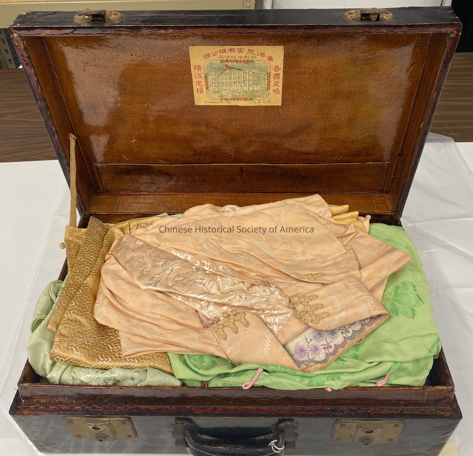 A note found inside the suitcase reads, "Bruce - In the kitchen - Old clothes - old teapot - Smoking jacket. Donated by Mr. & Mrs. David Lew relative of Ray Fong 25SEP94 Madie"