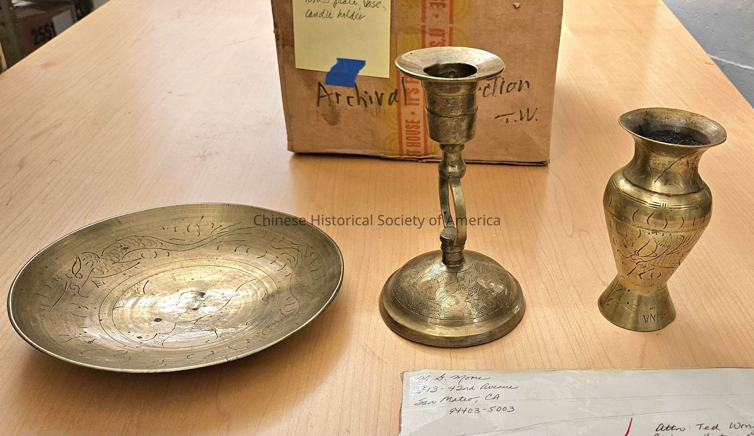 (A) L-dish with fish motif etched in, (B) C-candle stick holder with flower motif etched in, (C) R-urn with dragon motif etched in; all are stamped with "China"