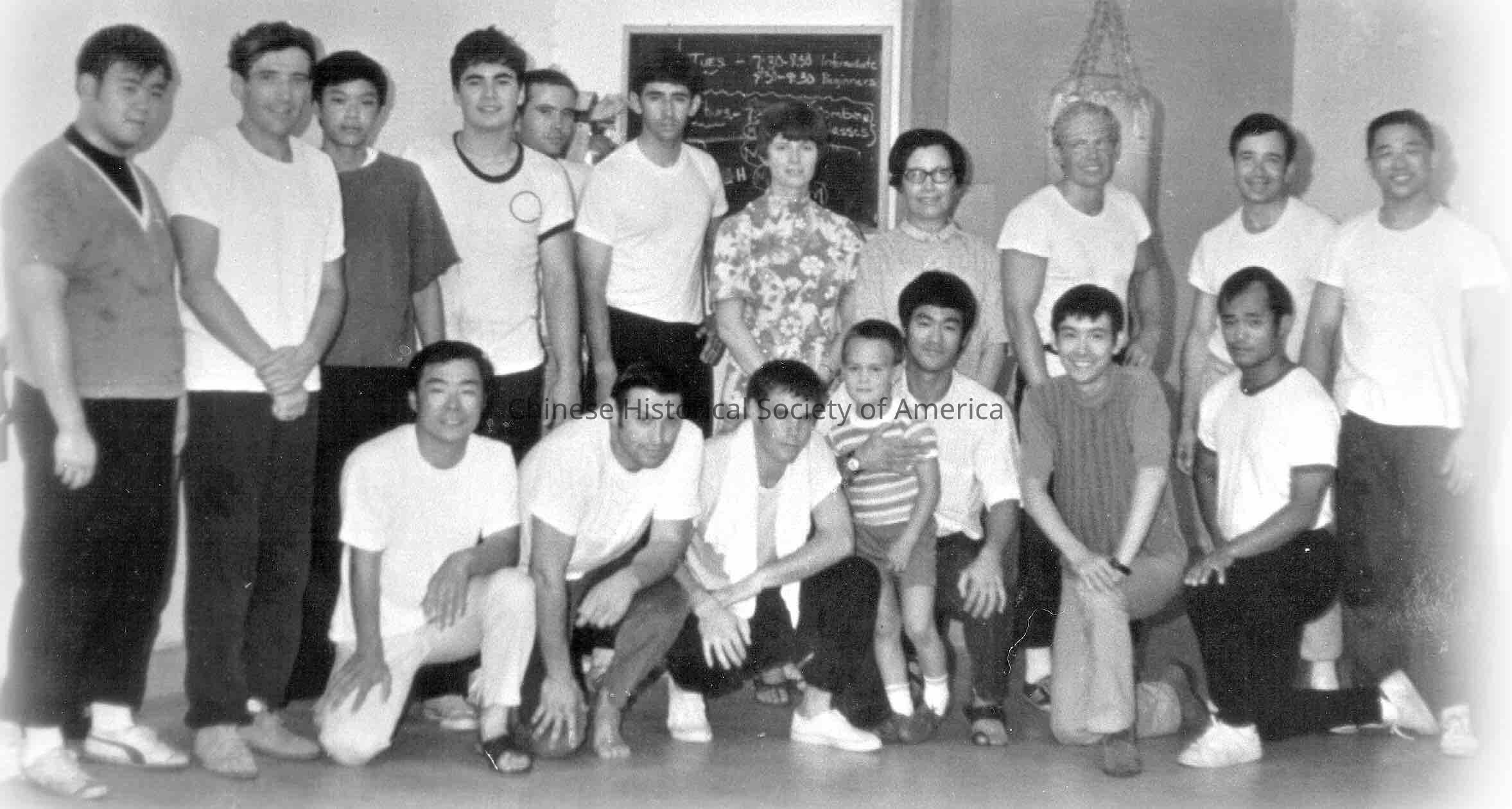 Bruce Lee with gung fu school, holding son Brandon in arms, front right center, kneeling in large group with many students and family members, including Linda Lee, Bruce's mother Grace Ho (top center), Robert Lee, brother, Dan Inosanto (R, bottom). Jun Fan Gung Fu institute, Seattle.Context