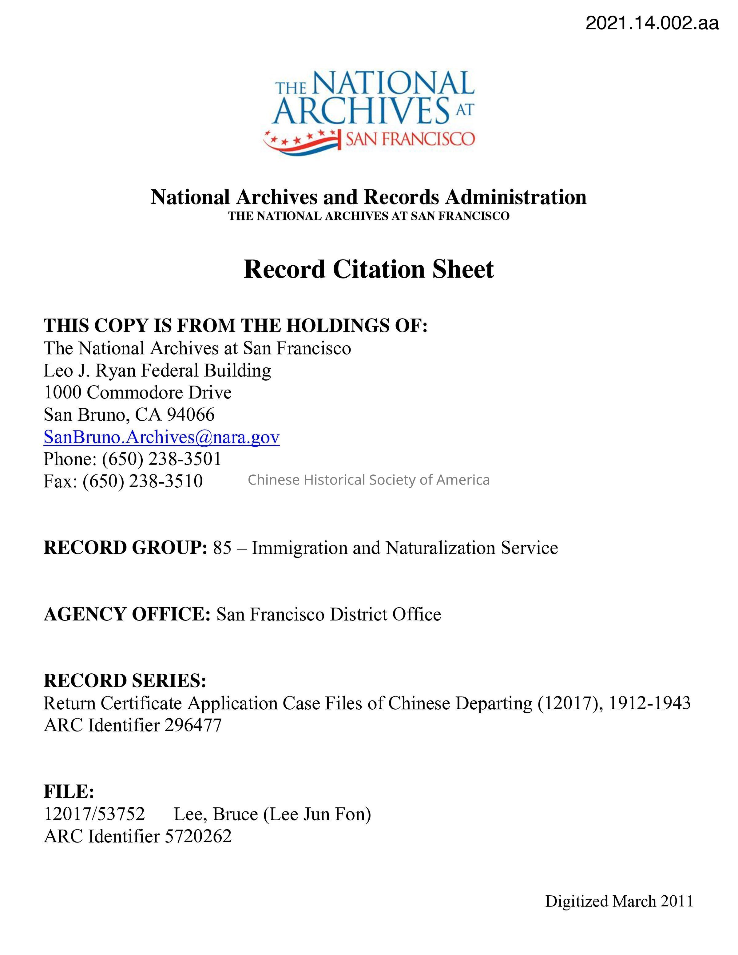 Bruce Lee Naturalization and Birth Certificate DocumentsEntry/Object ID