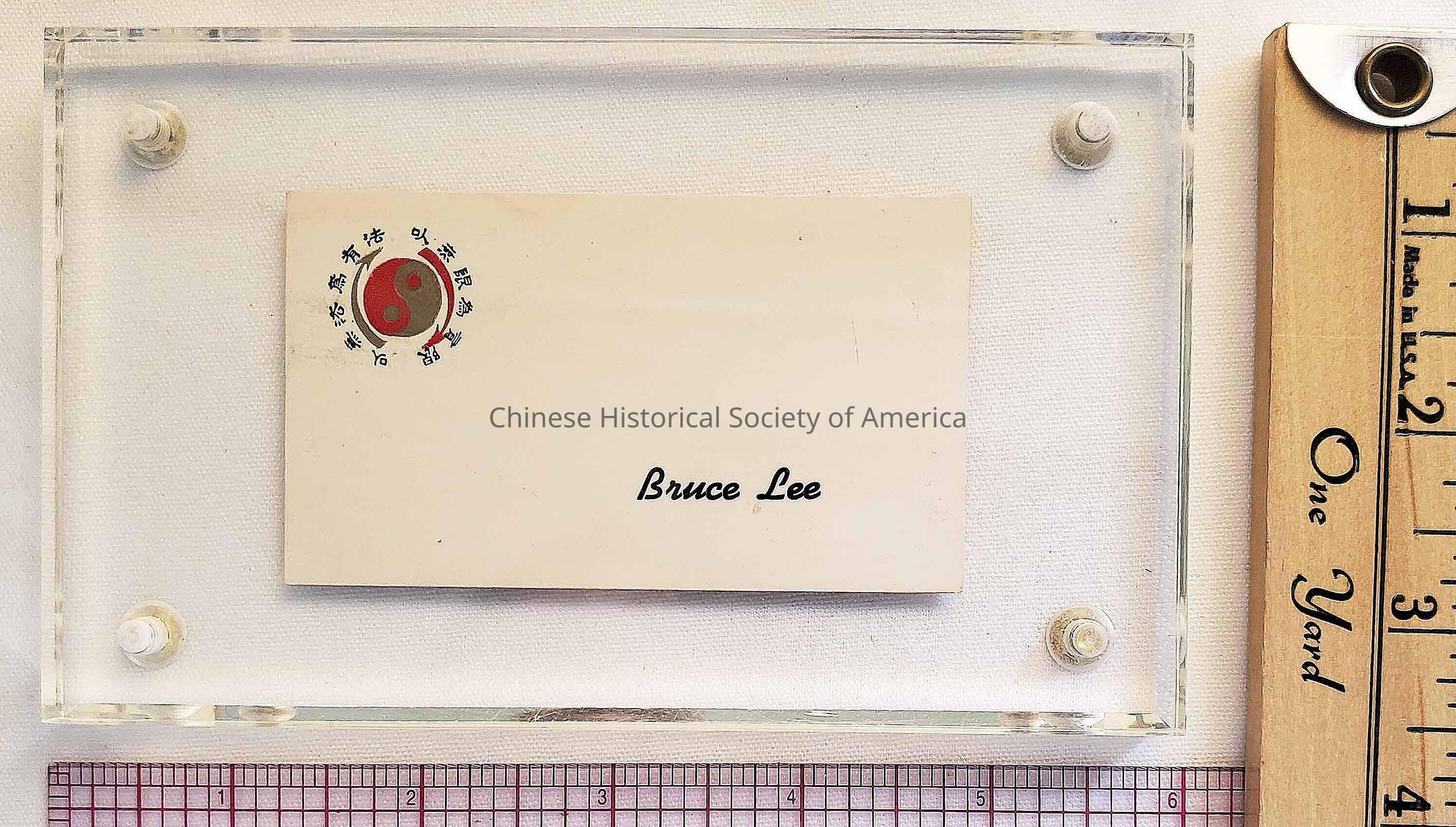 Business card for Bruce Lee; verso: Jeet Kune Do training rates, original, encased in plexi.