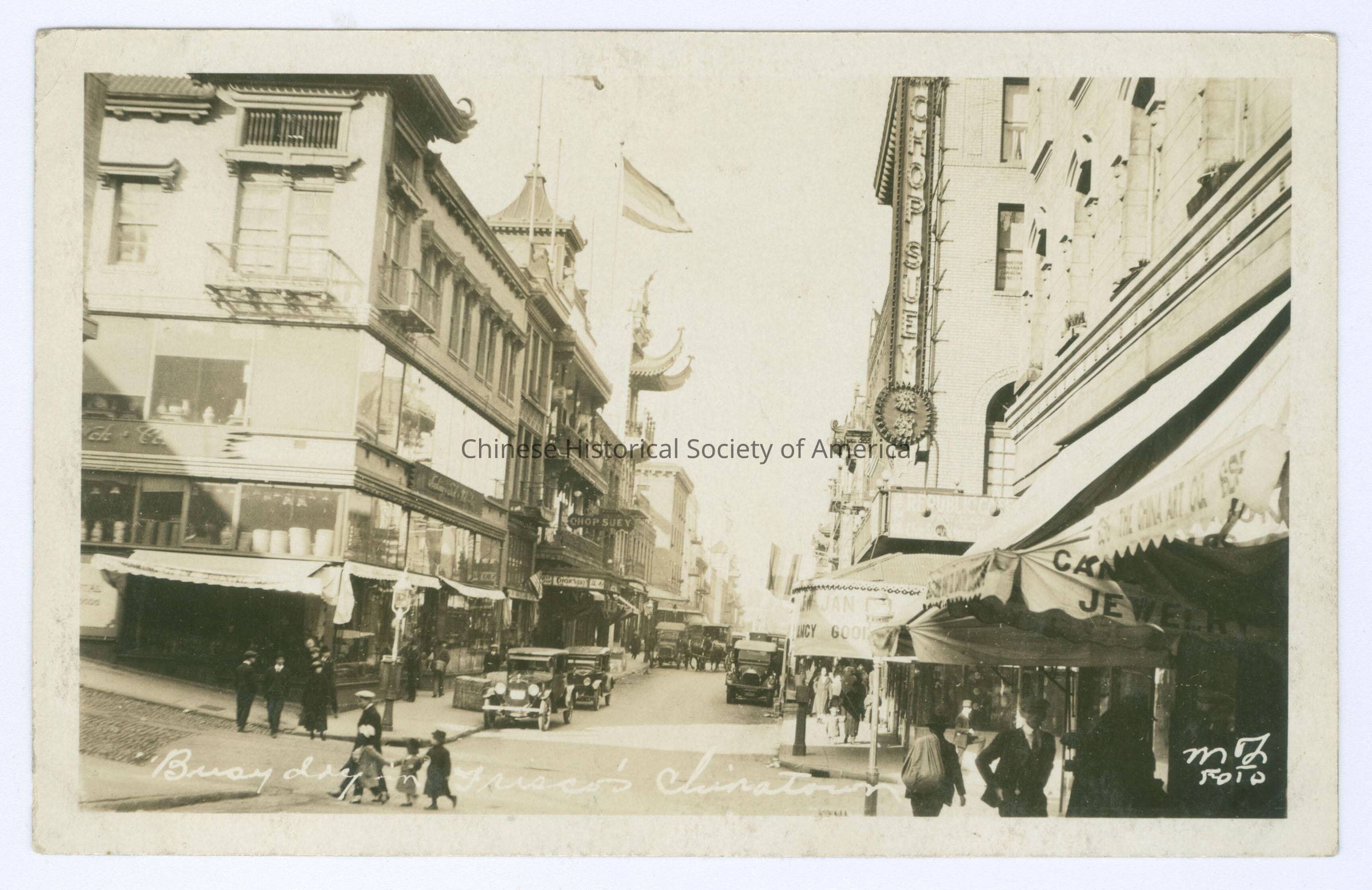 Front: Caption: "Busy Day in Frisco's Chinatown, MJ Foto." Back: "Busy Day In Frisco's Chinatown", handwritten in pencil. Old Accession #: D)-