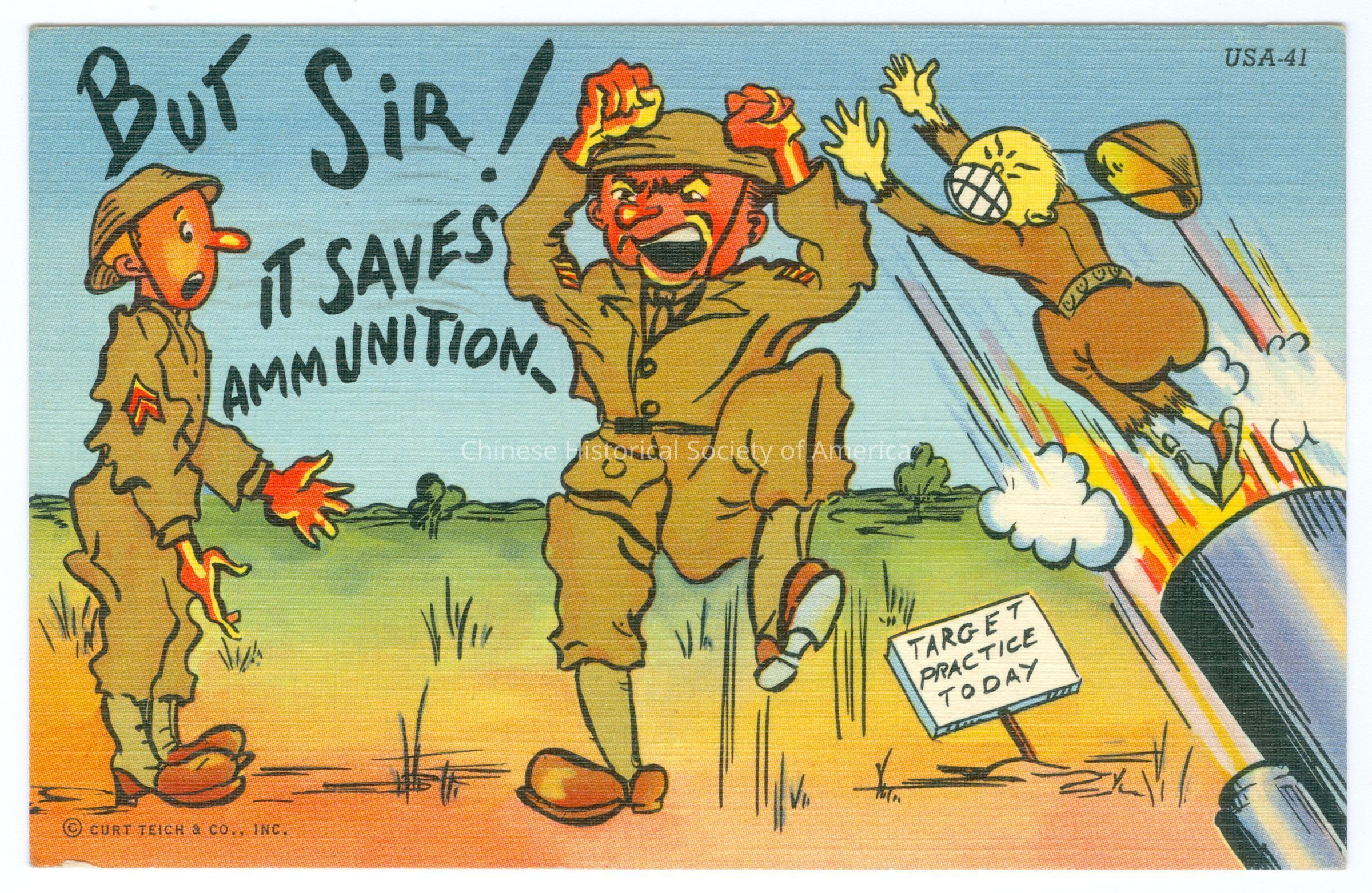 Color. Illus. Japanese; Caricatures; Army: Cartoon figures of a soldier talking to his superior who is mad while a "Japanese" person with a yellow face and slanted eyes is being shot out of a canyon with a sign that says "Target Practice Today."