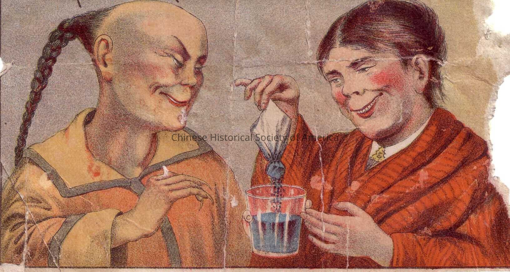 Front: An Asian man with a long queue and a Caucasian woman wearing a dress with a red cloak over it are smiling and emptying the contents of a blue dye into a cup of water. The Orientalised Chinese man has slanted eyes with a bald forehead and also long finger nails, is looking sinisterly as he grasps the glass cup while the woman who is smiling wickedly, holds the blue bag of dye.