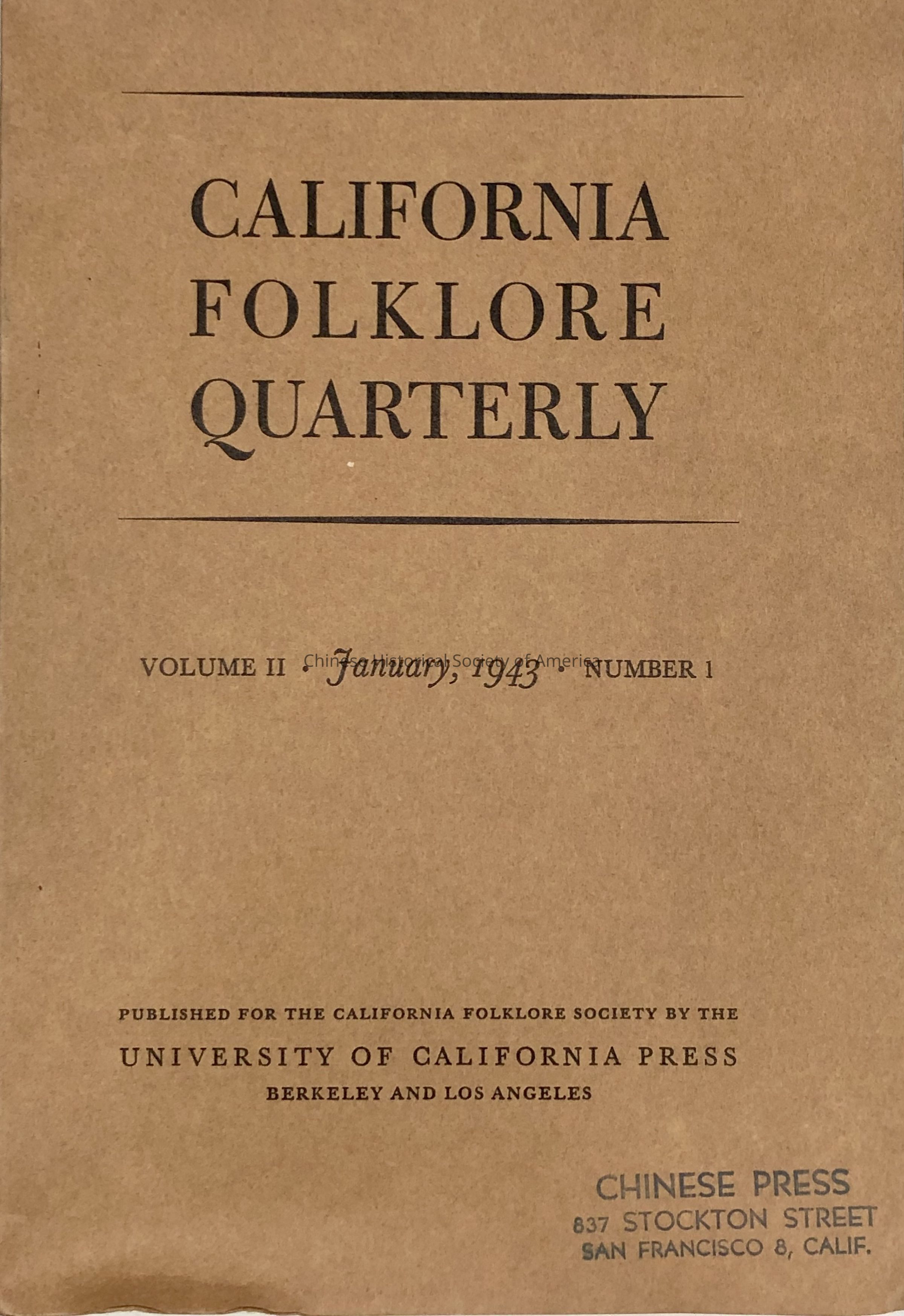 Quarterly magazine of the California Folklore Society, whose purposes are the collecting, preservation, and publication of folk materials of the State of CaliforniaPublication Details