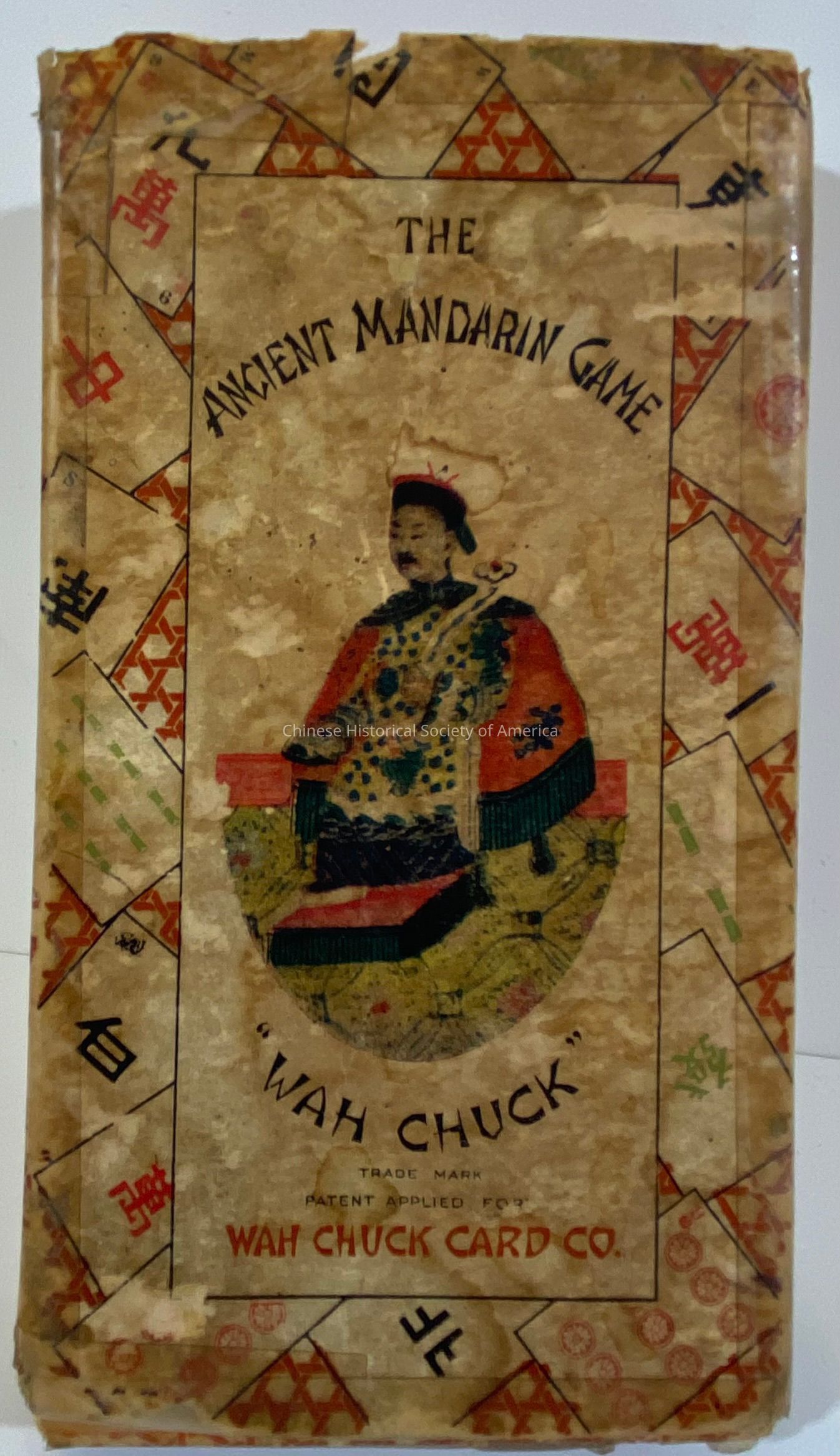 "The Ancient Mandarin" card game in original box. The lid reads, "The Ancient Mandarin Game, 'Wah Chuck,' trademark Patent Applied for Wah Chuck Card Co". The game is a version of mah-jongg, that is played with cards. The lid features an illustration of a man dressed in traditional Chinese outfit. Inside are various cards with Chinese characters. The box also reads, "Wah Chuck Card Co., 404 Grant Ave San Francisco, CAL., USA." On the bottom side of the box, it reads, "The Ancient Mandarin Game Wah Chuck." Card backing has a picture of a lantern and alternating diagonal lines crossing.