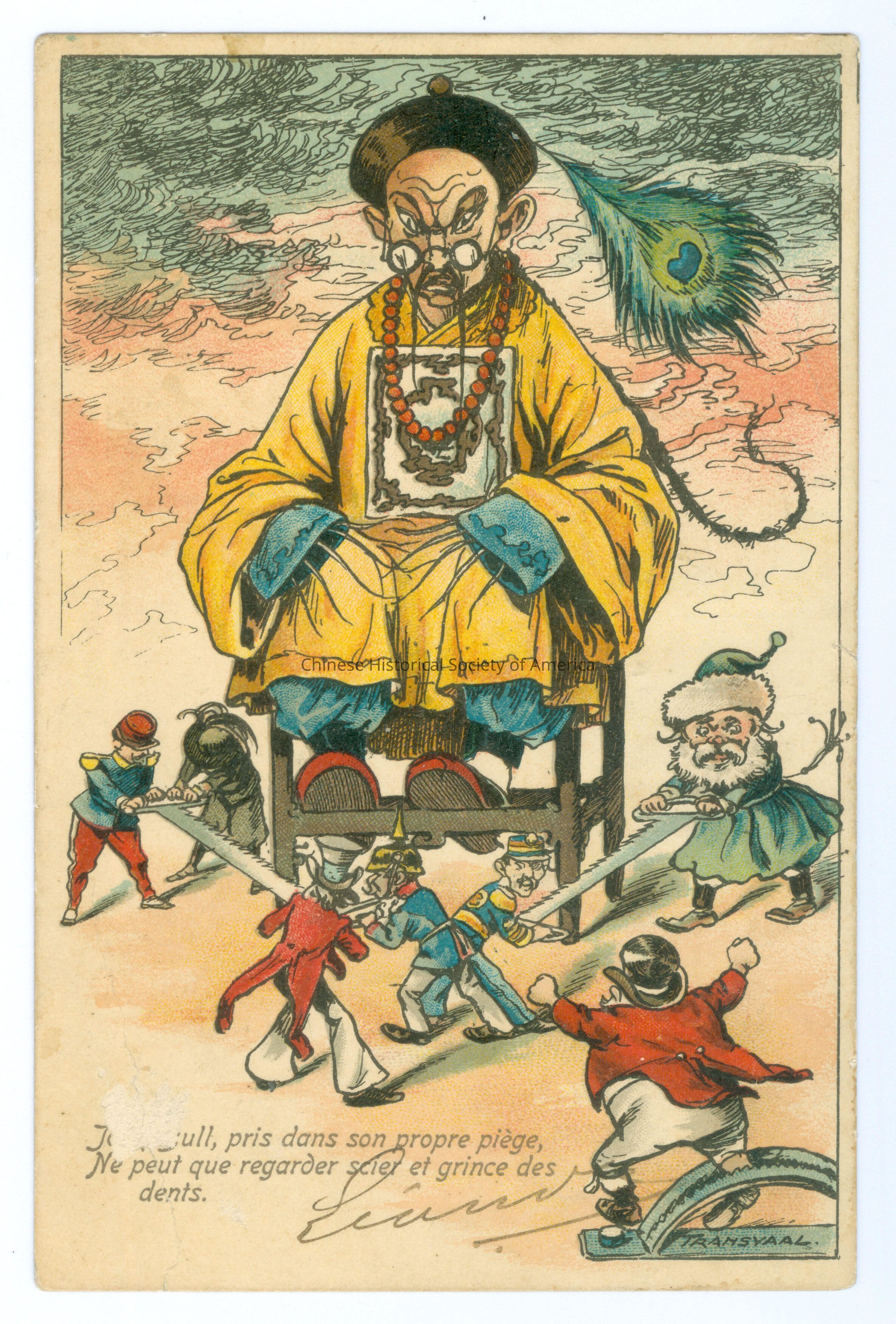 Color. Illus. Caricatures; Chinese Men; Giant Chinese man with a hat is sitting on a chair, he has large slanted eyes with glasses and queue and skinny mustache, he has on a yellow robe with claw like finger nails snaking out from the sleeves, there are little White men in uniform using saws to saw away at the legs of the chair, another man in a hat and red is yelling while his leg is caught in a trap. Front: Caption: "____, pris dans son propre piege, Ne peut que regarder scier er grince des dents." "Transvaal". Back: "Belgigue. Monsieur. Mons Gaston Tander [ILLEGIBLE] 36 Rue Neuchatet 36 Saint-Gilles Bruxelles Imprime." Old Accession #: TNGXX
