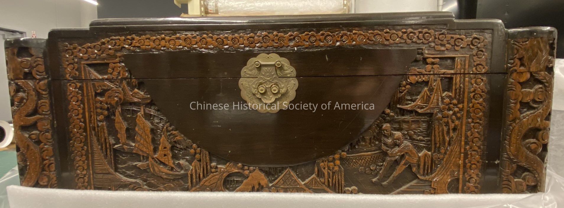Carved, cedar, wooden trunk with elaborate designs throughout. Inside is an engraved metal lock.