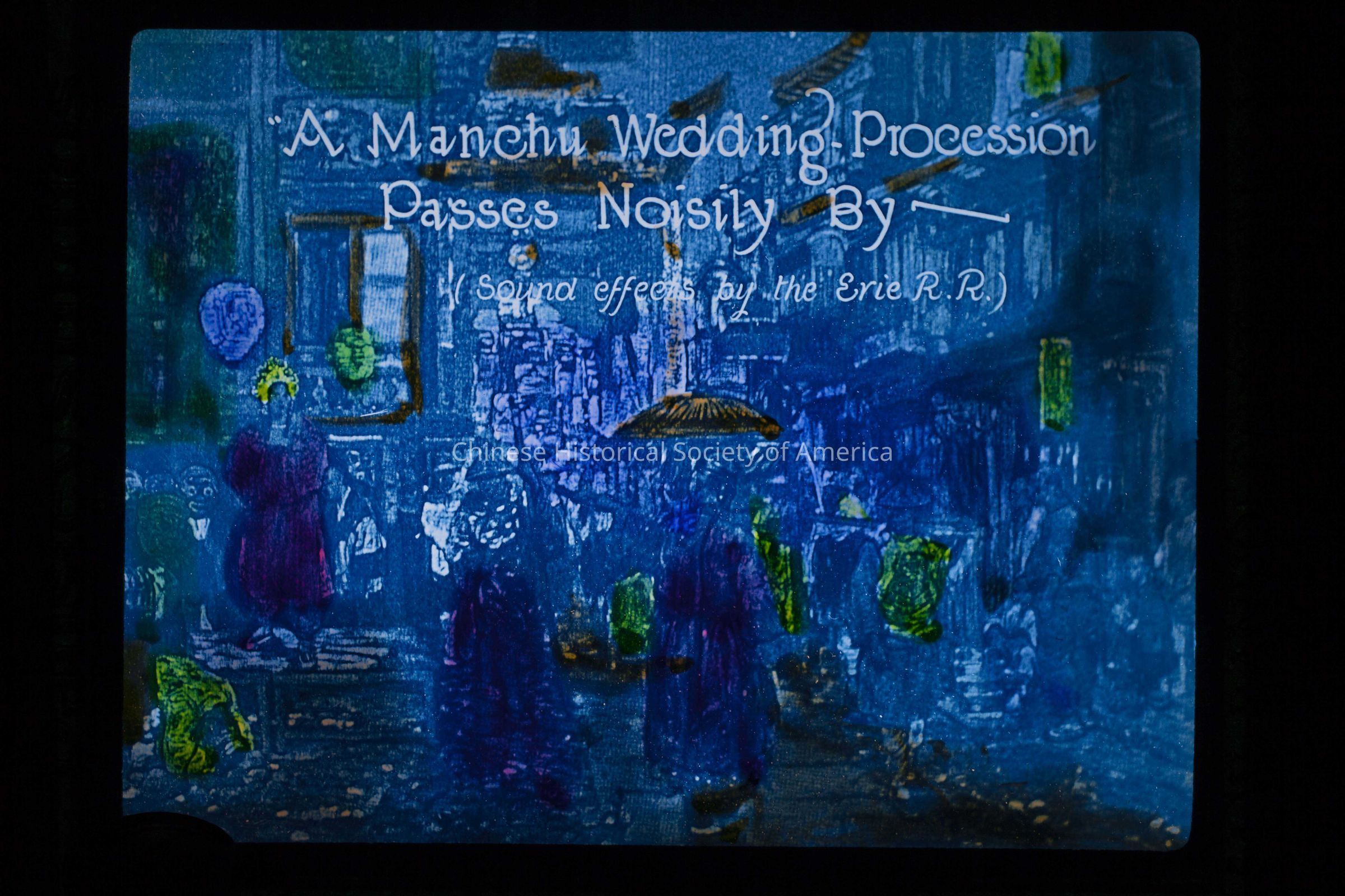 Text in the slide: "A Manchu Wedding Procession Passes Noisily By-(Sound Effects by the Erie R.R.)" Text in the front: "Ransley Studios, 54 Randolph St., Chicago"; "5", handwritten in pencil on a label stuck to the slide; "N)-", handwritten in pencil.