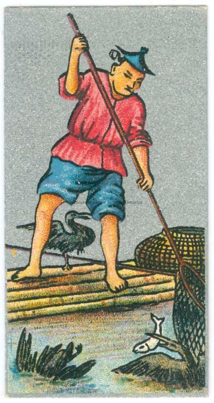 Color. Illus. England; London; Cavanders Ltd.: Silver background with an illus. of a Chinese man on a bamboo raft fishing with cormorants, he has a fishnet dipped into the water. See CHSA-07862-07886. Back: "Ancient Chinese No. 17"; "In some part of China cormorants are used for fishing. The fisherman usually stands upon a raft made of bamboos and propelled by a paddle. He has 3 or 4 tame cormorants, which dive and catch fish, but are prevented from swallowing them by a string round the neck. When a bird rises to the surface with a fish, the fisherman catches both bird and fish in a net and takes the fish.Dimensions