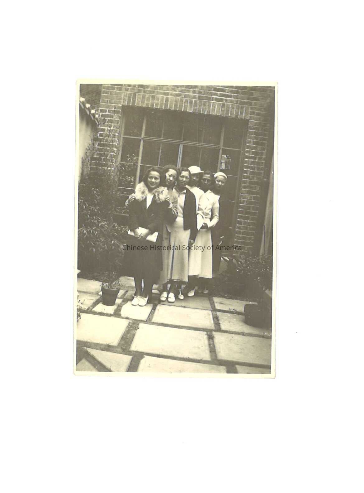 Black and white photo of six Chinese women standing in front of a window in the CHSA courtyard.