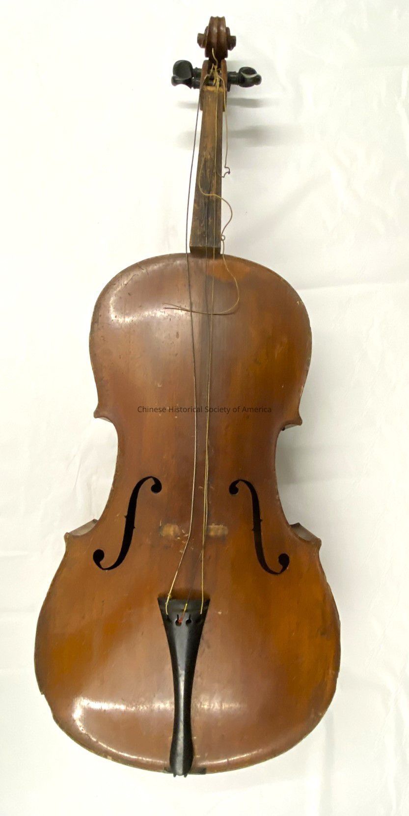 Wooden cello that was used by a member of the Cathay Band. the cello has a bridge, that is not attached. There is an tan/olive greenish colored canvas carrying bag, and a bow.Context