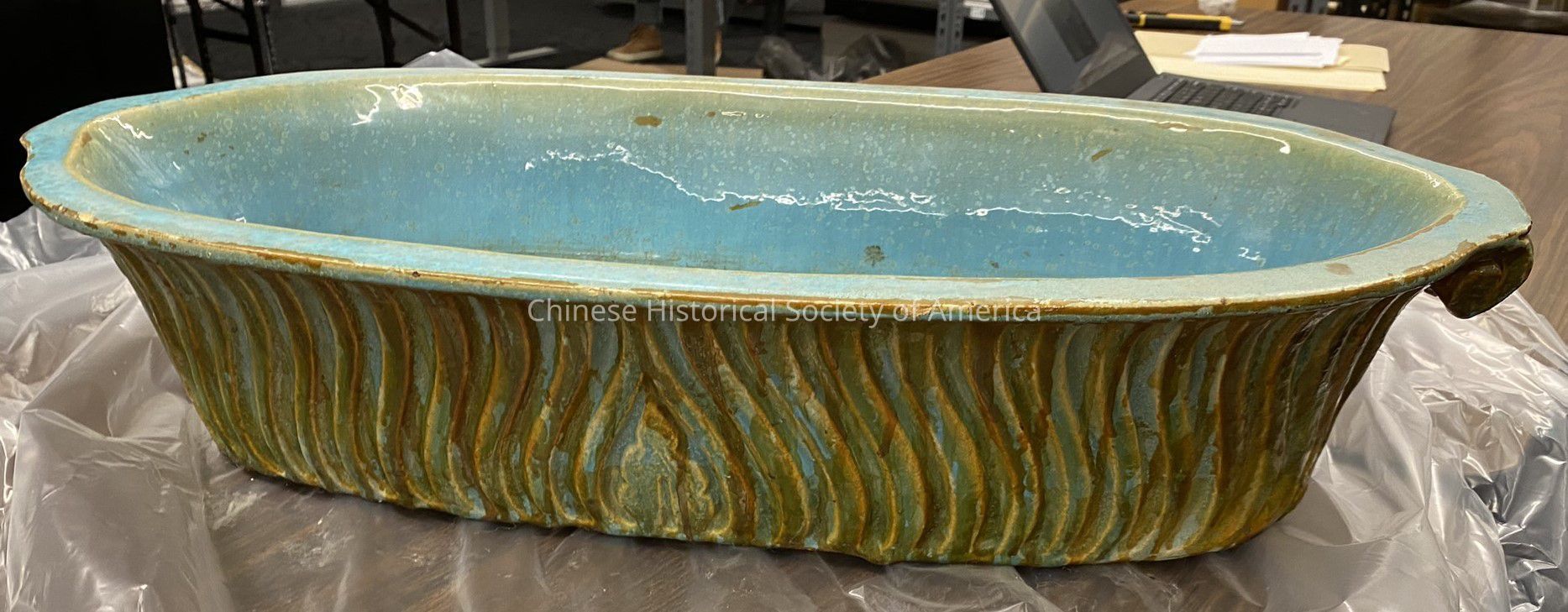 Ceramic basin with turquoise and brown glaze. The basin is oval shaped, with scrolled handles on either side, and it has wavy fluting throughout the outer wall. The number 11082 is handwritten on the bottom. There are sixteen, small, rough feet along the bottom edge.Dimensions