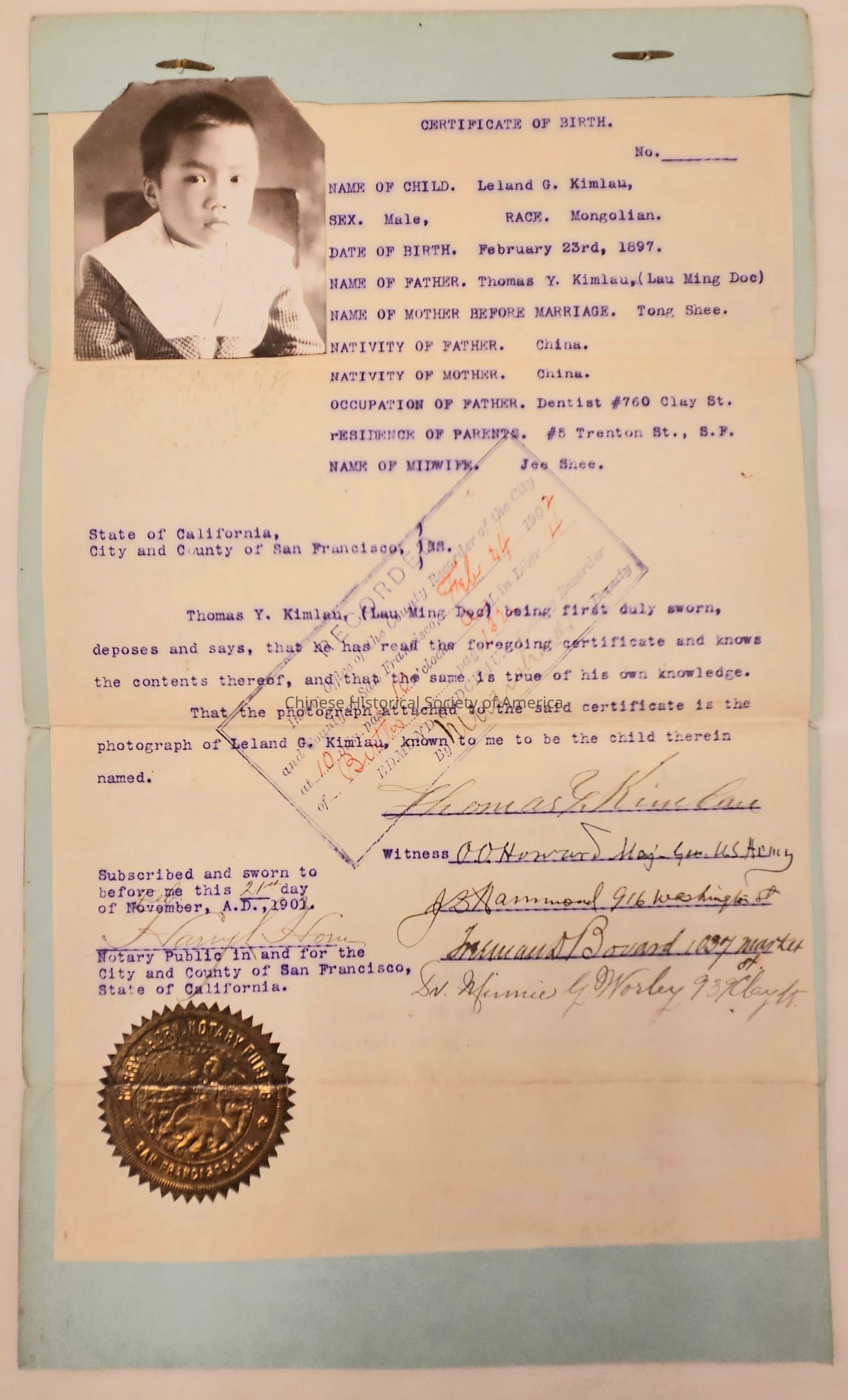 Leland Kimlau, born Feb. 23rd, 1897, certificate dated February 1902 - San Francisco Hall of RecordsContext