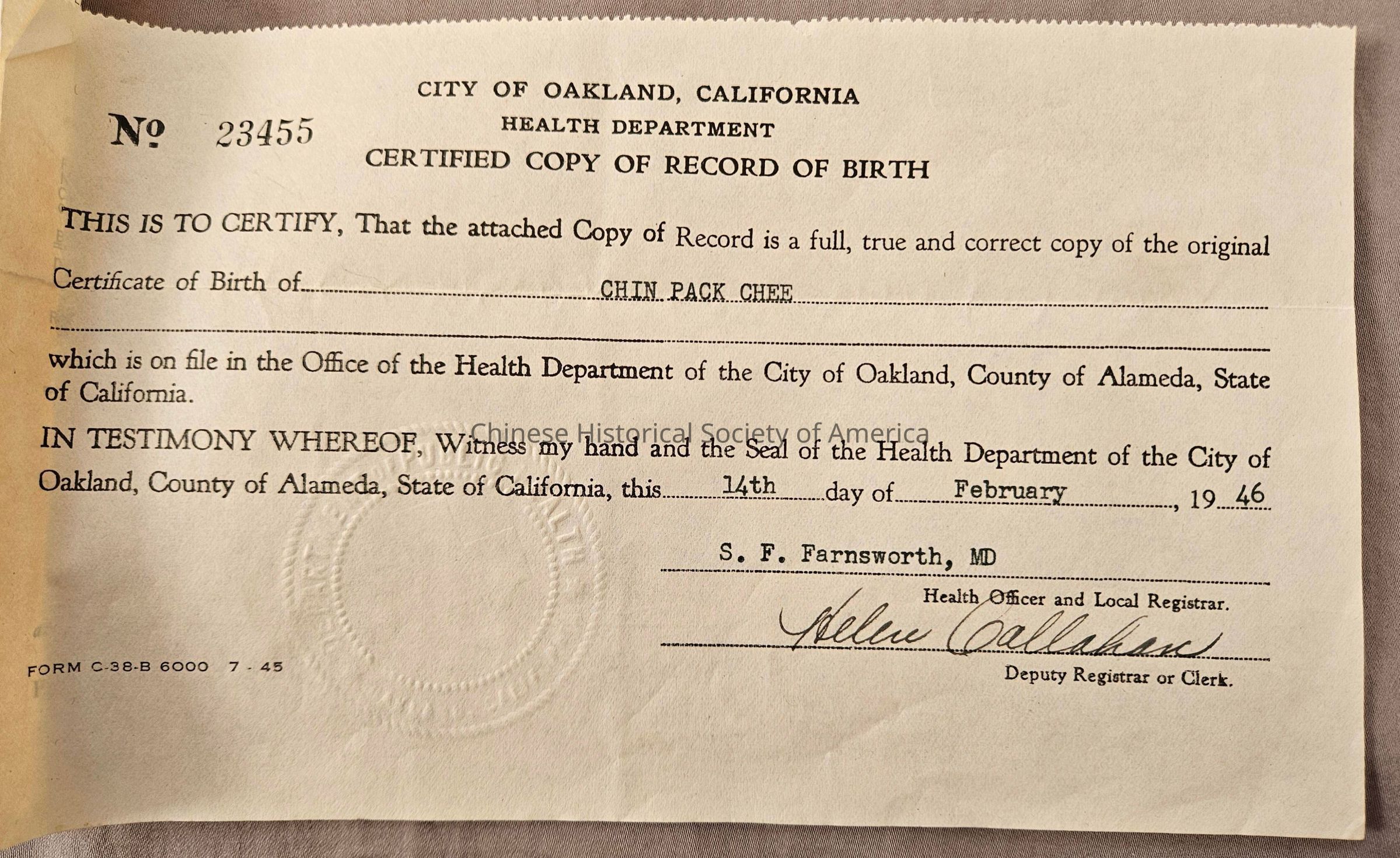 Elwood B Chan 1913 October 24 (Chin Pack Chee) Oakland California 335 5th Street Oakland, California 2 pages