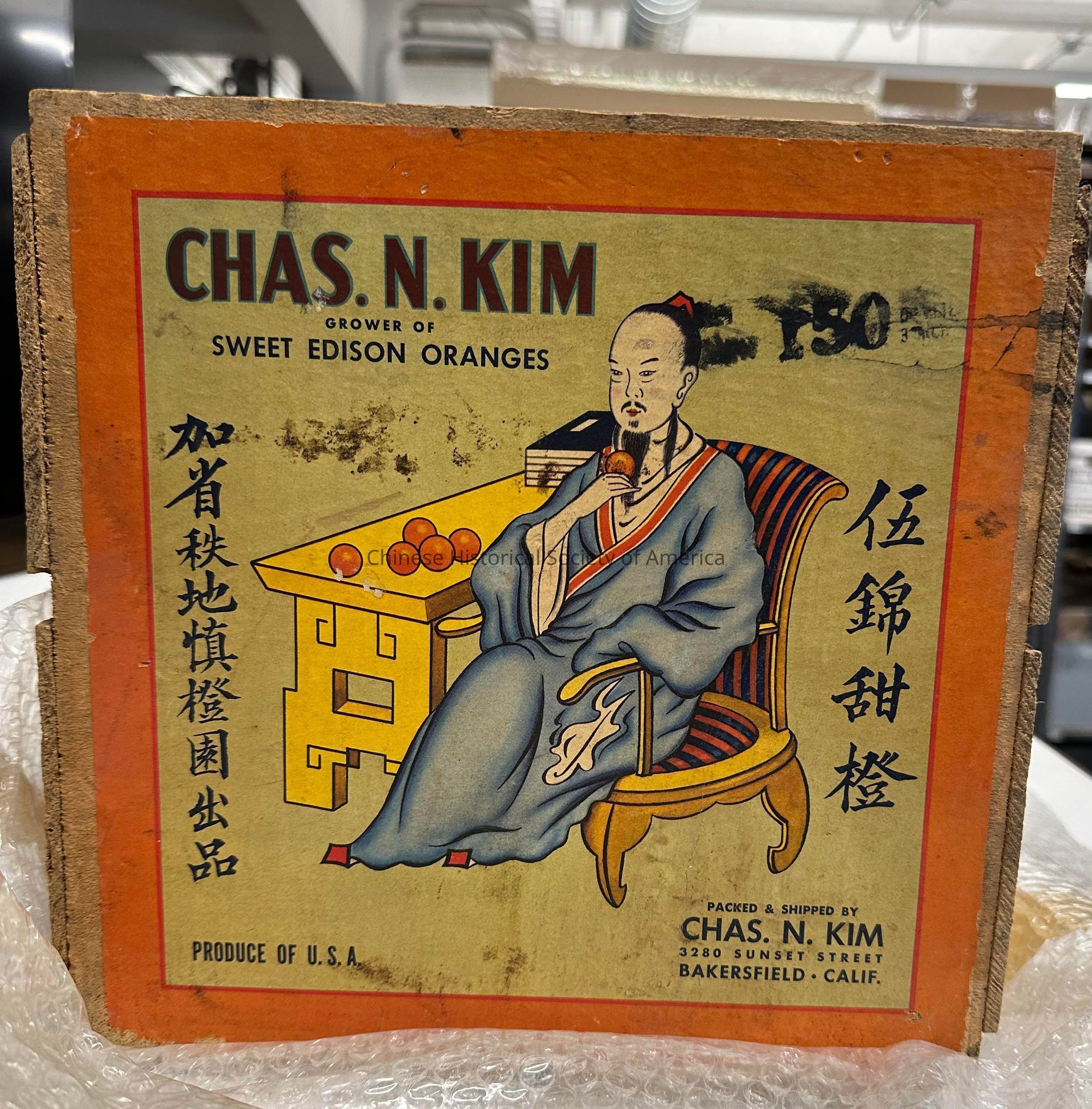 "Chas N. Kim was born in San Francisco (circa 1882), and moved to Kern county in 1900 to work as a cook at the N.P. Peterson farm. Six years later he came to Bakersfield, and in 1908 was employed by Standard Oil to supervise cook houses at Taft. He later engaged in the hotel business and was active in civic affairs of the large Chinese community which grew up on the West Side in the early (19)20s. He farmed at Dinuba and in the Cuyama Valley before returning in the late (19)20s to become a citrus grower in the Edison area. He developed the famous brand of Chas N. Kim Oranges which he distributed throughout the United States, and exported to Hong Kong and the Philippines." -from Newspaper Archive, Article clipped from Bakersfield Californian, dated Tue, Feb 06, 1962Dimensions