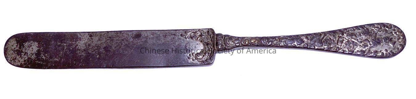 Silver, slightly tarnished butter knife.