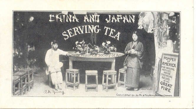 Back: Object ID#, Old Accession#: NDE and an illustration of a tower and two people dressed in traditional Asian robe and the following advertisement: