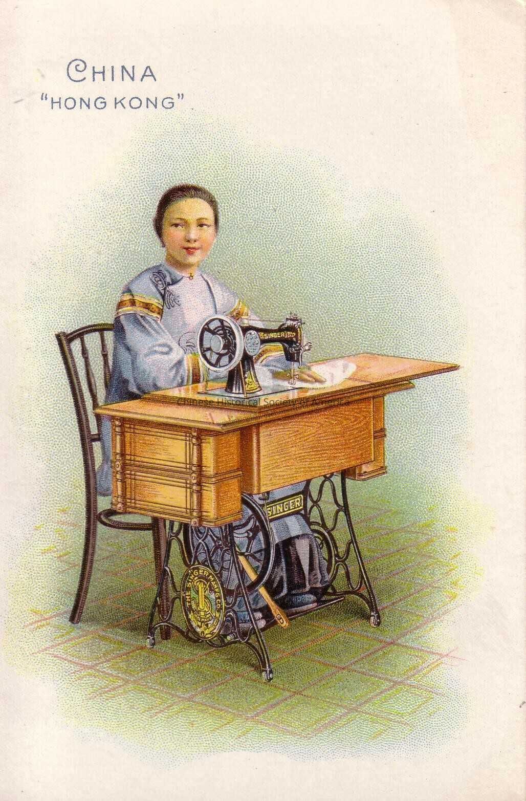 Front: A Chinese woman wearing a traditional blue and yellow embroidered gown is sitting on an chair in front of a Singer sewing machine table. She has both of her feet resting on the foot pedal that is attached to the machine, and her hands is guiding a white cloth along it. Written on the tradecard is the following: China "Hong Kong"