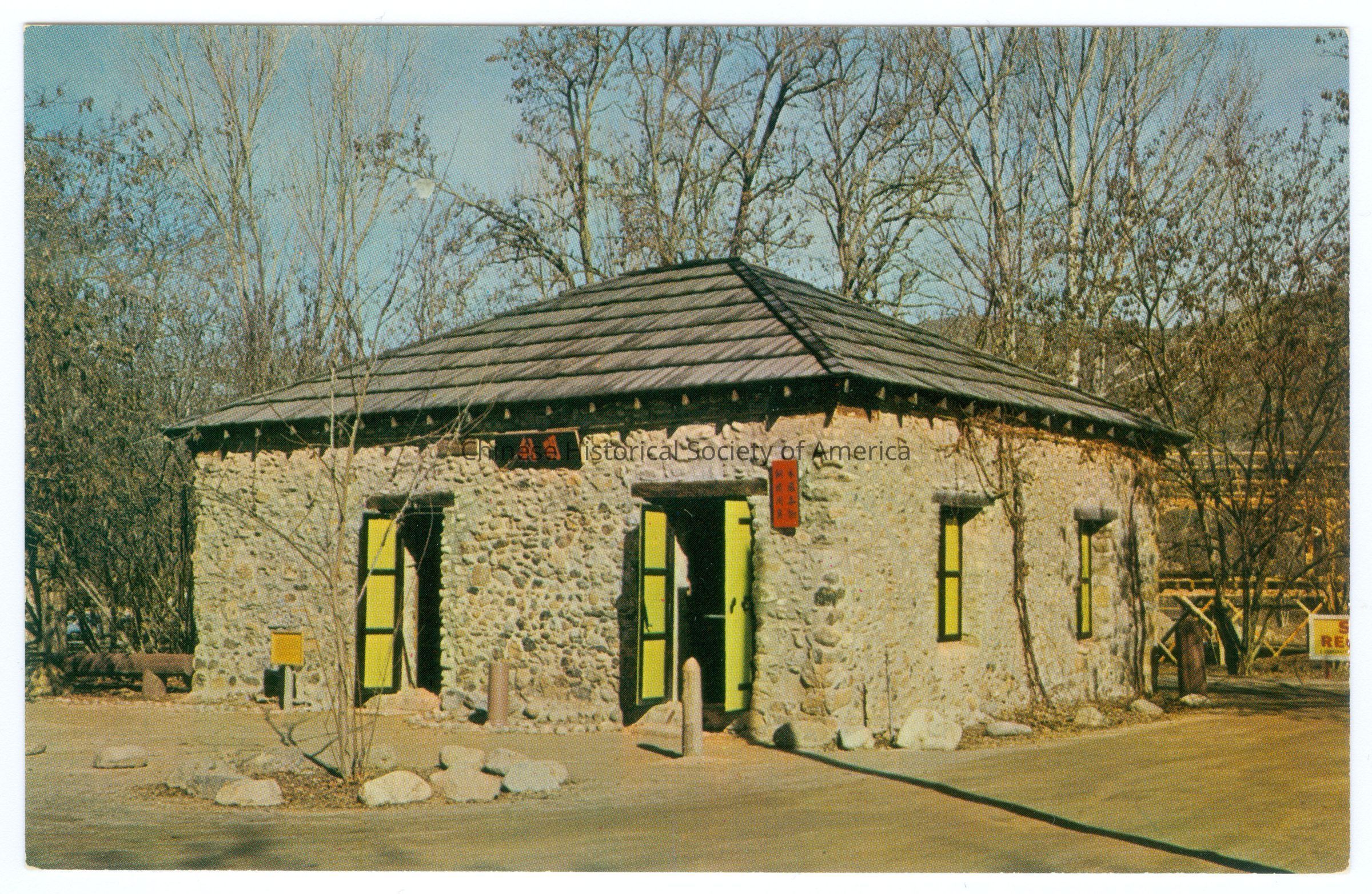 Color. Photo. California; Coloma; Store: View of a stone brick building with a shingled roof with yellow stained windows, there is a wood sign with with red Chinese characters and a red sign near the door.