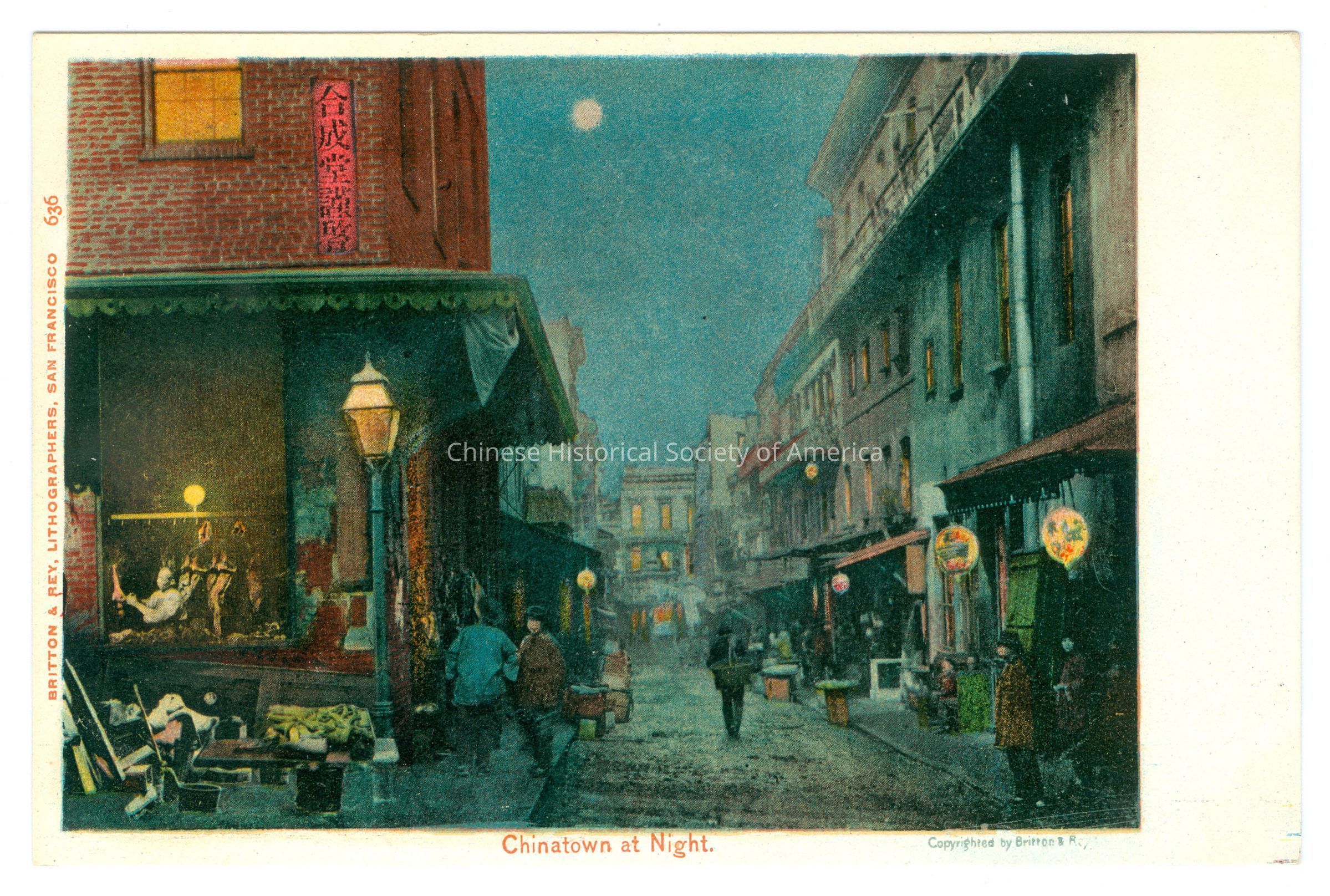 Front: Caption: "Chinatown at Night." "Britton & Rey, Lithographers, San Francisco 636." Back: Old Accession #: N)-